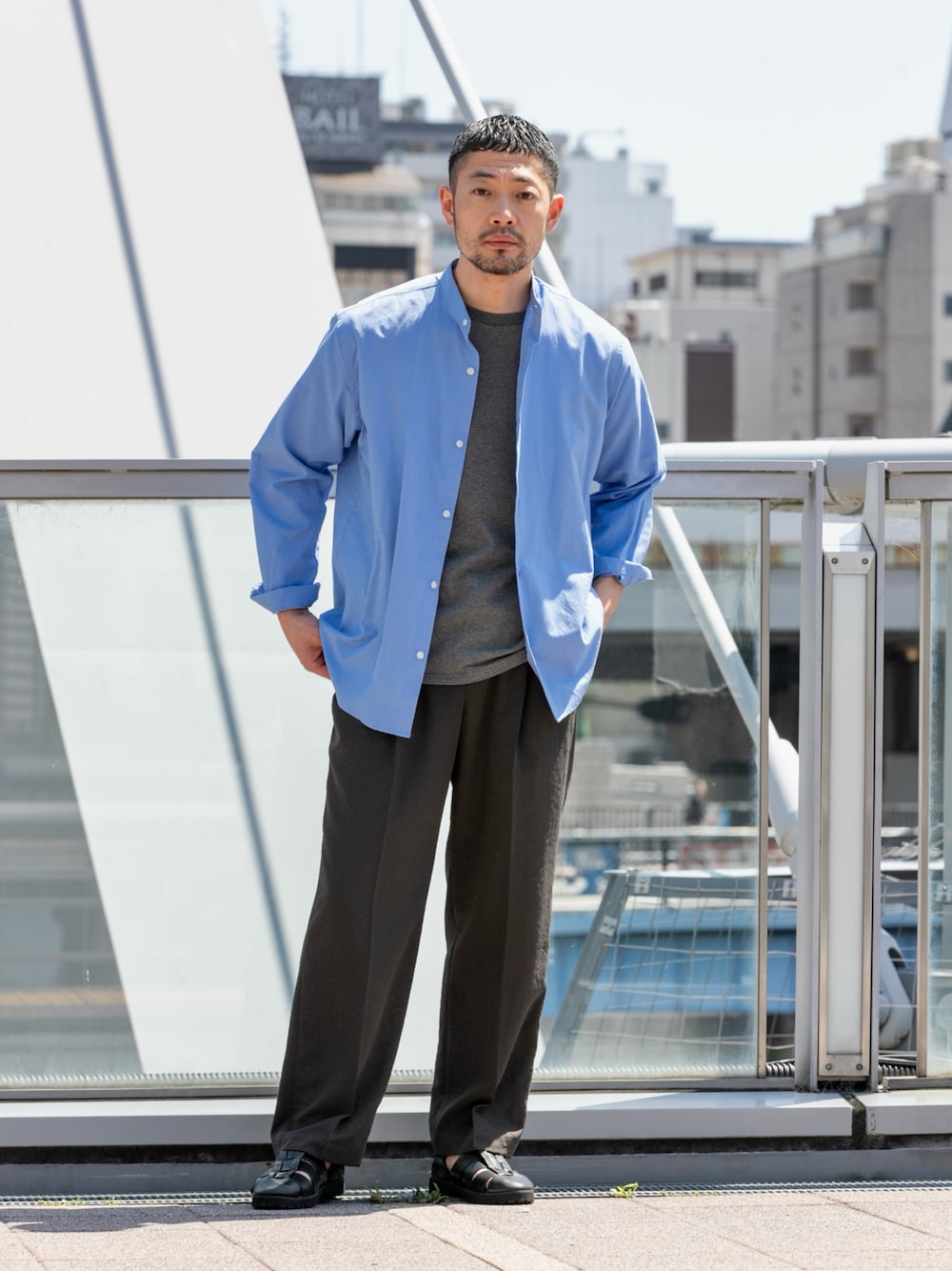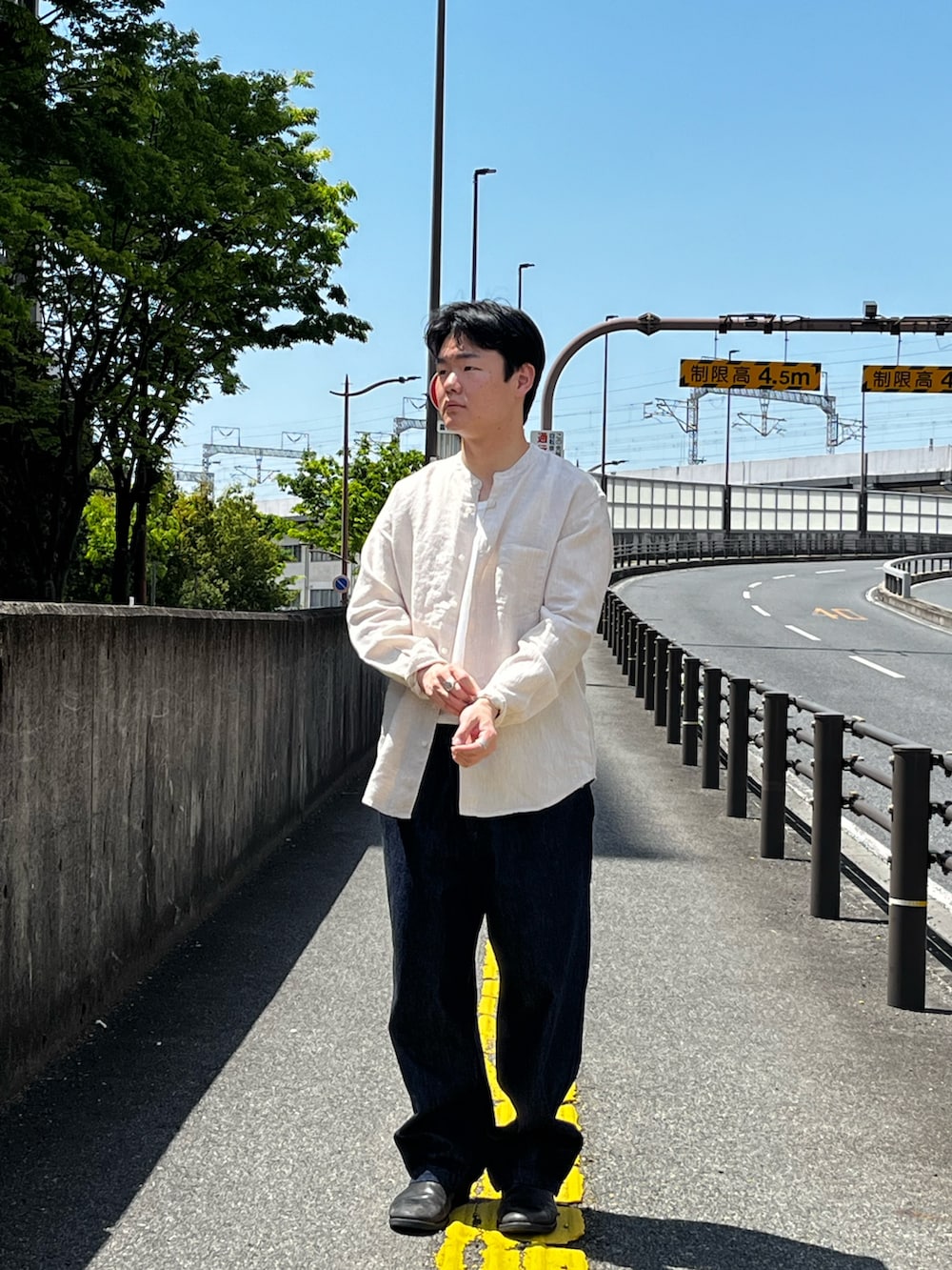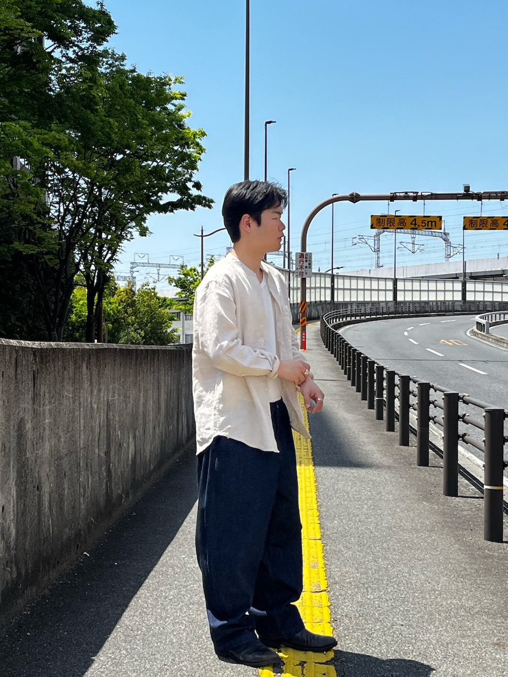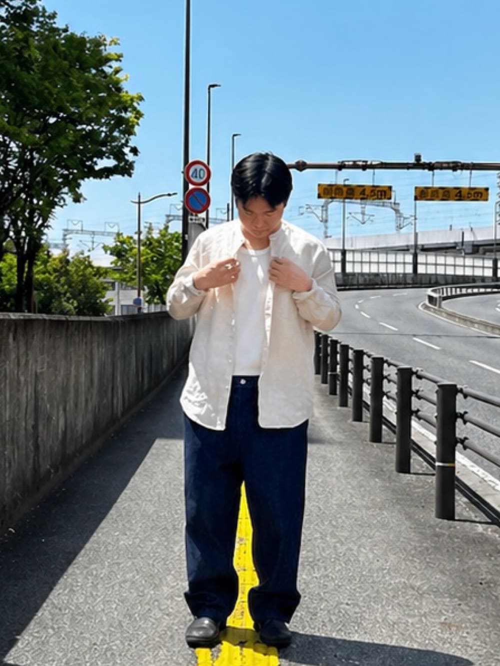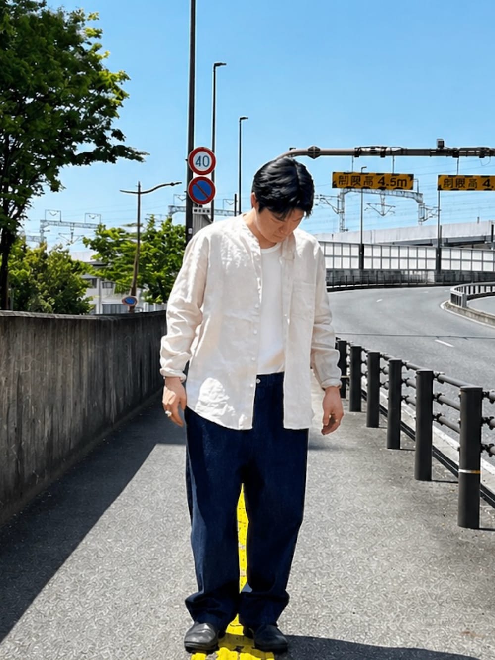 タンクトップにリネンシャツ。