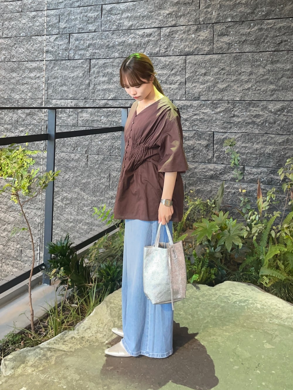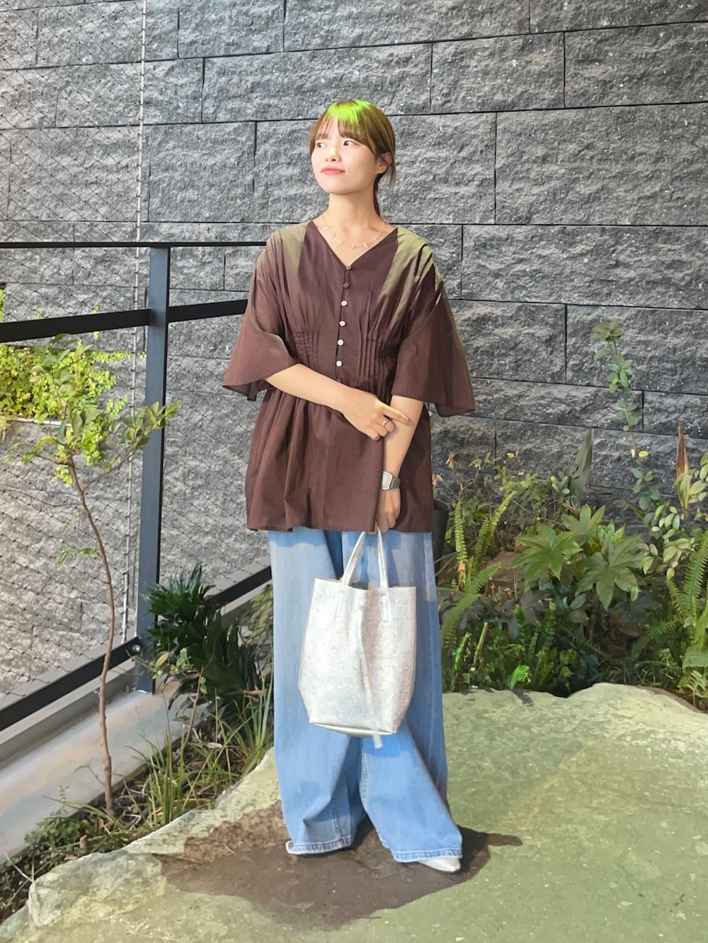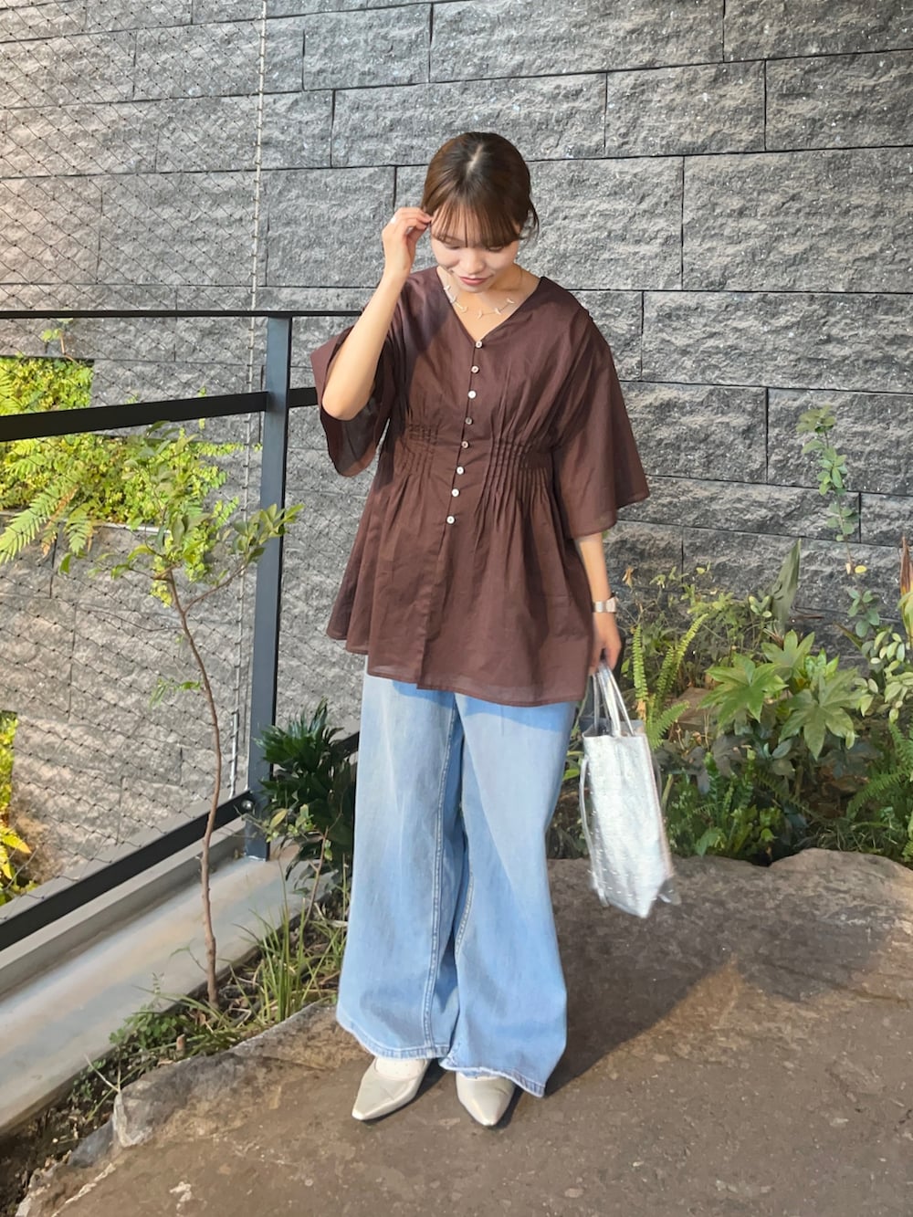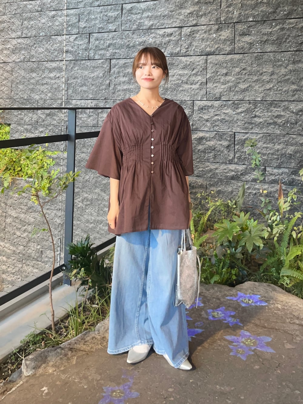 ボトムスは綿麻デニムイージーパンツです!昨年度も大人気だったデニムパンツが今年も出ました✨ワイドな形でゆったり履けるシルエットと、麻素材が使われた柔らかなデニムに履くと感動するのでぜひ店頭で試着してみてください✨わたしの身長でウエストは折って履いてますので、低身長はお直しが必要です!