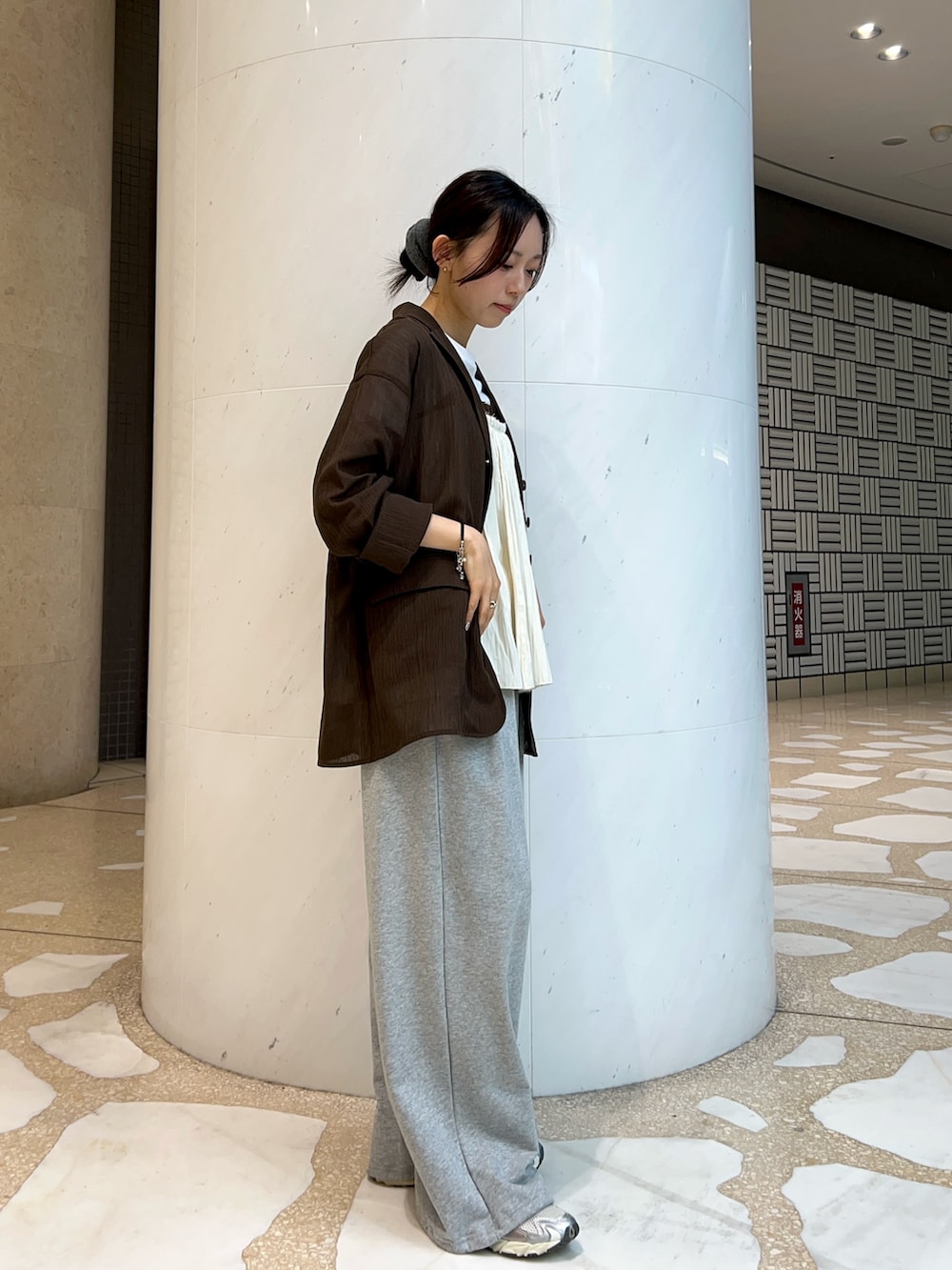 カッチリしすぎないようにスウェットパンツでラフなスタイリングにしました。