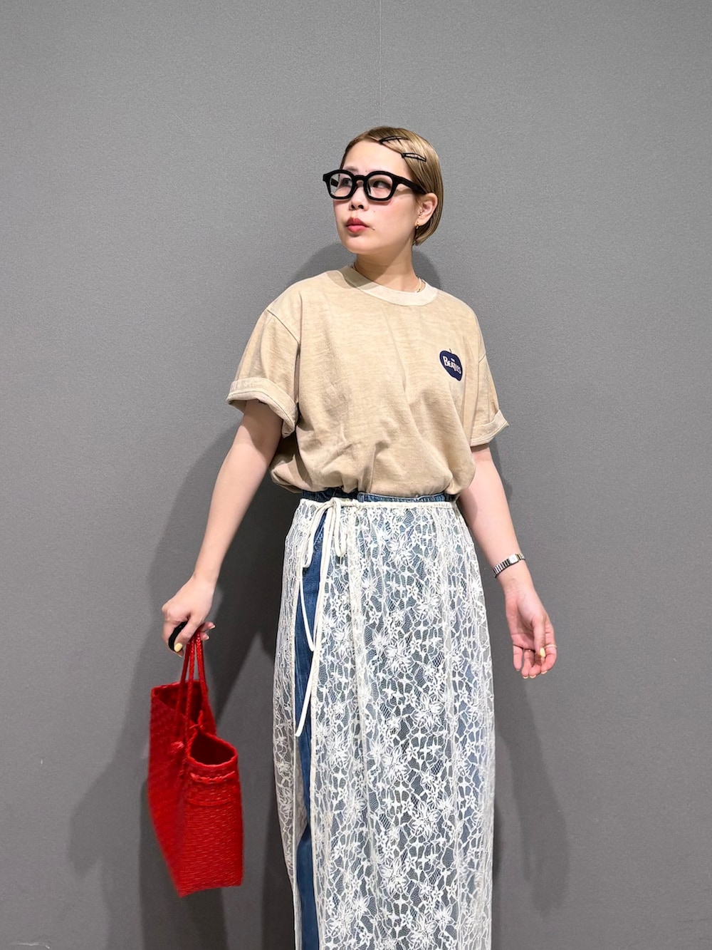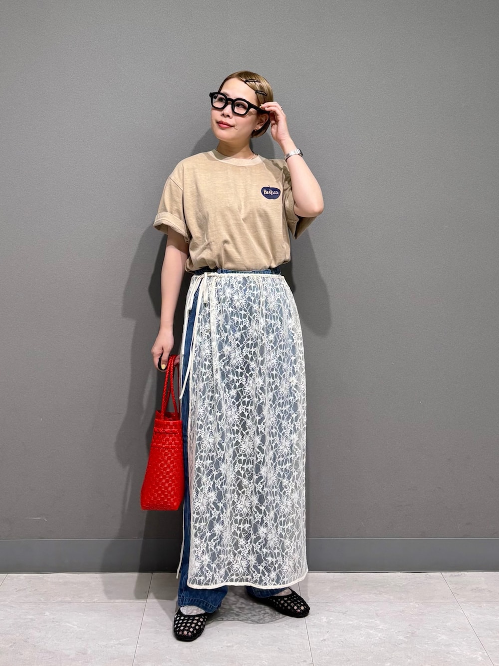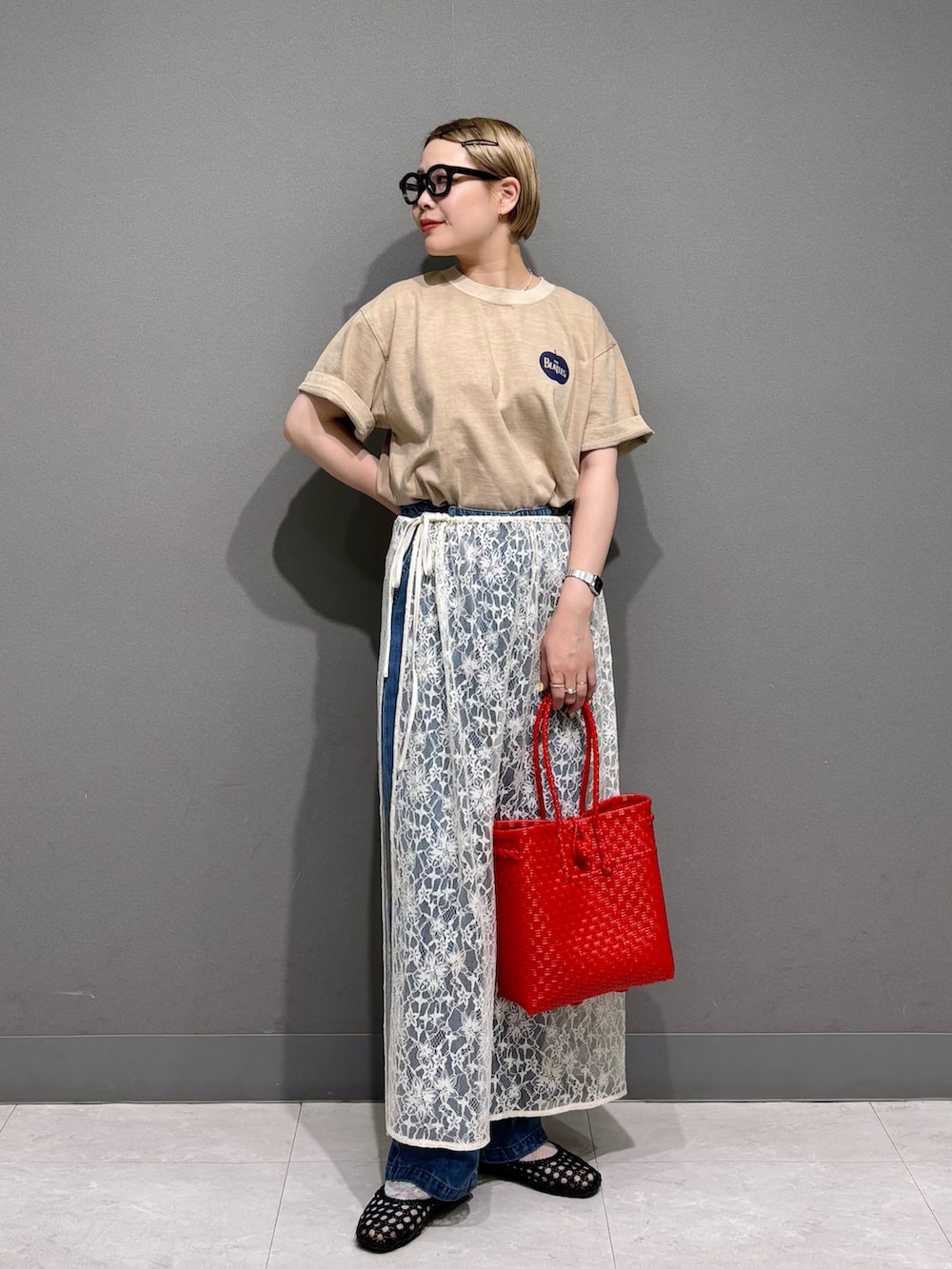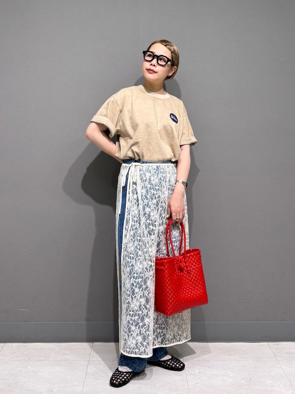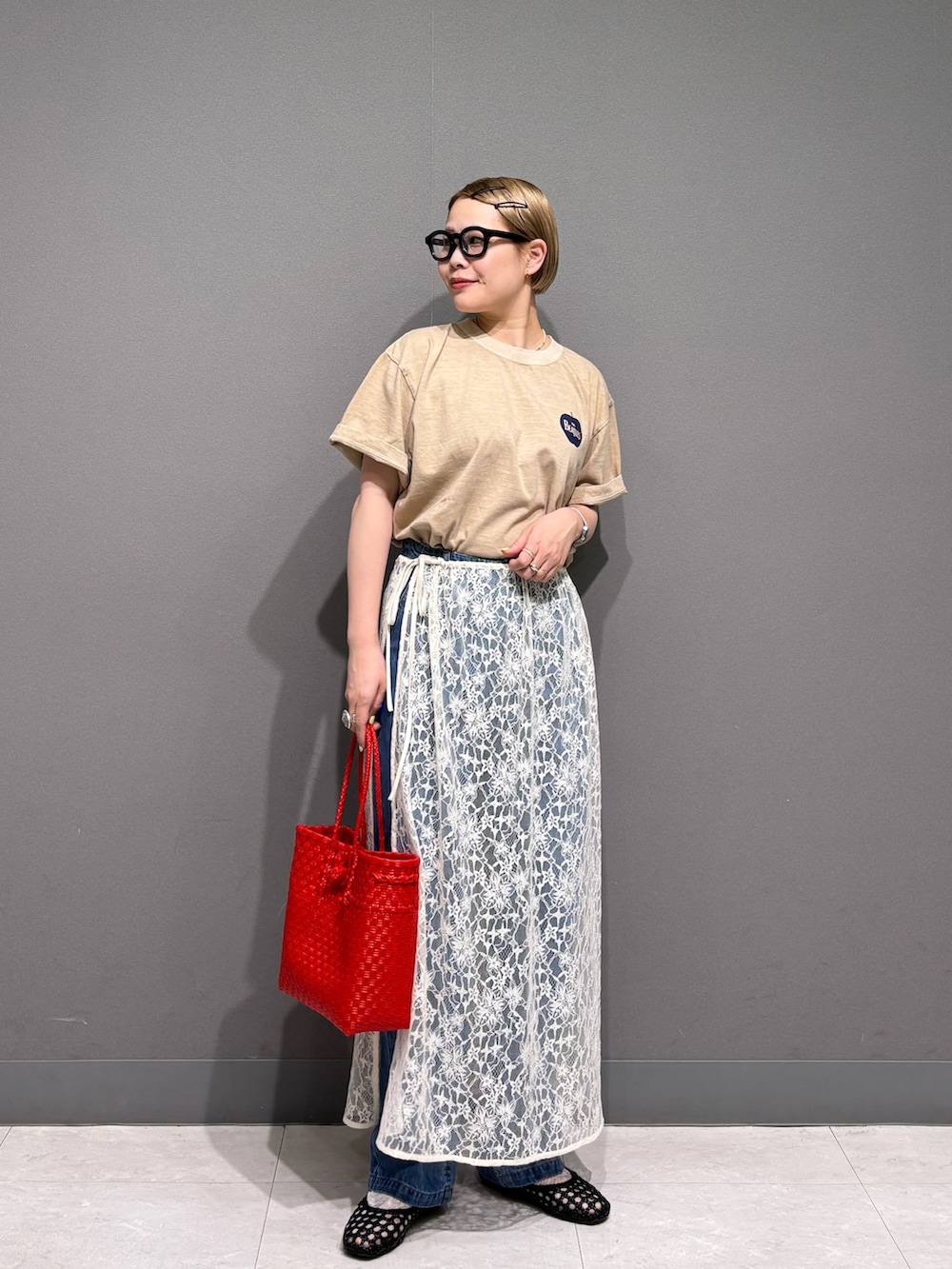 レースの巻きスカートをレイヤード。