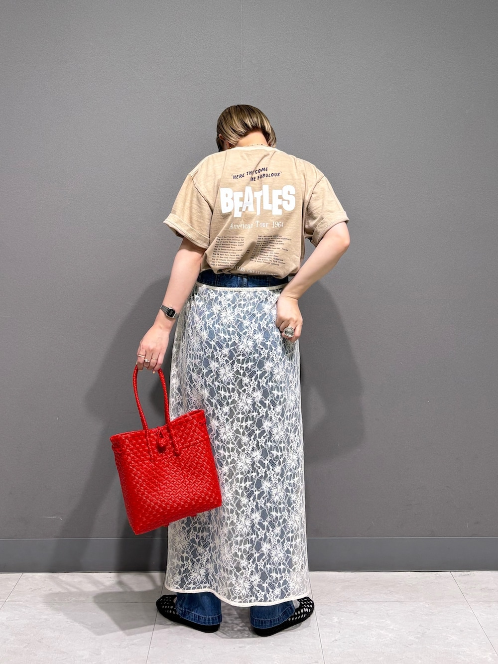 The BeatlesのTシャツにデニムを履いて、