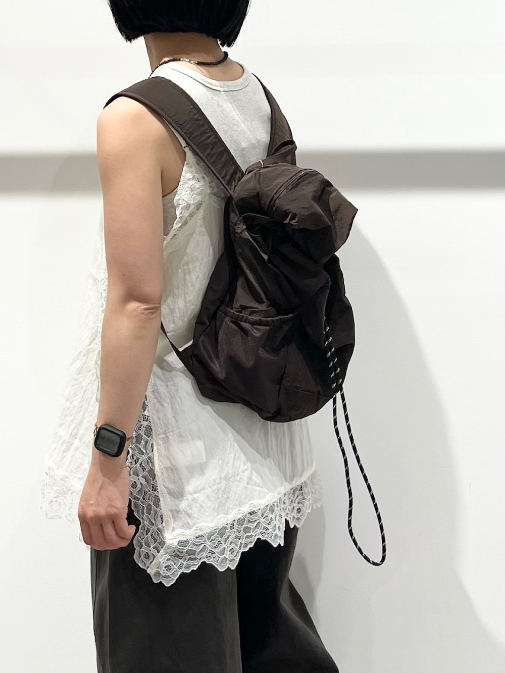 ナイロンリュックはコロンとしたシルエットが、ゆるシルエットをまとめてくれます。