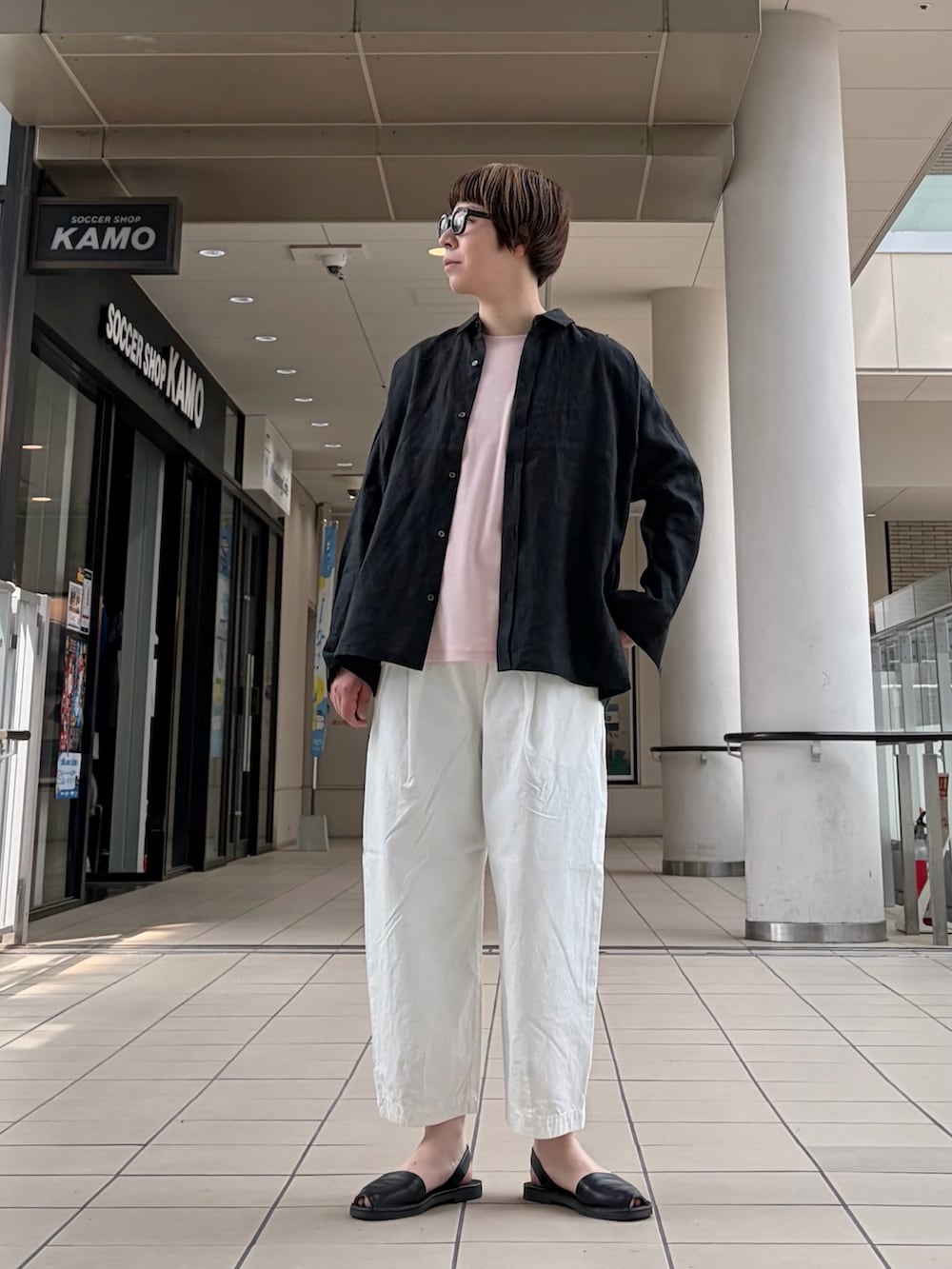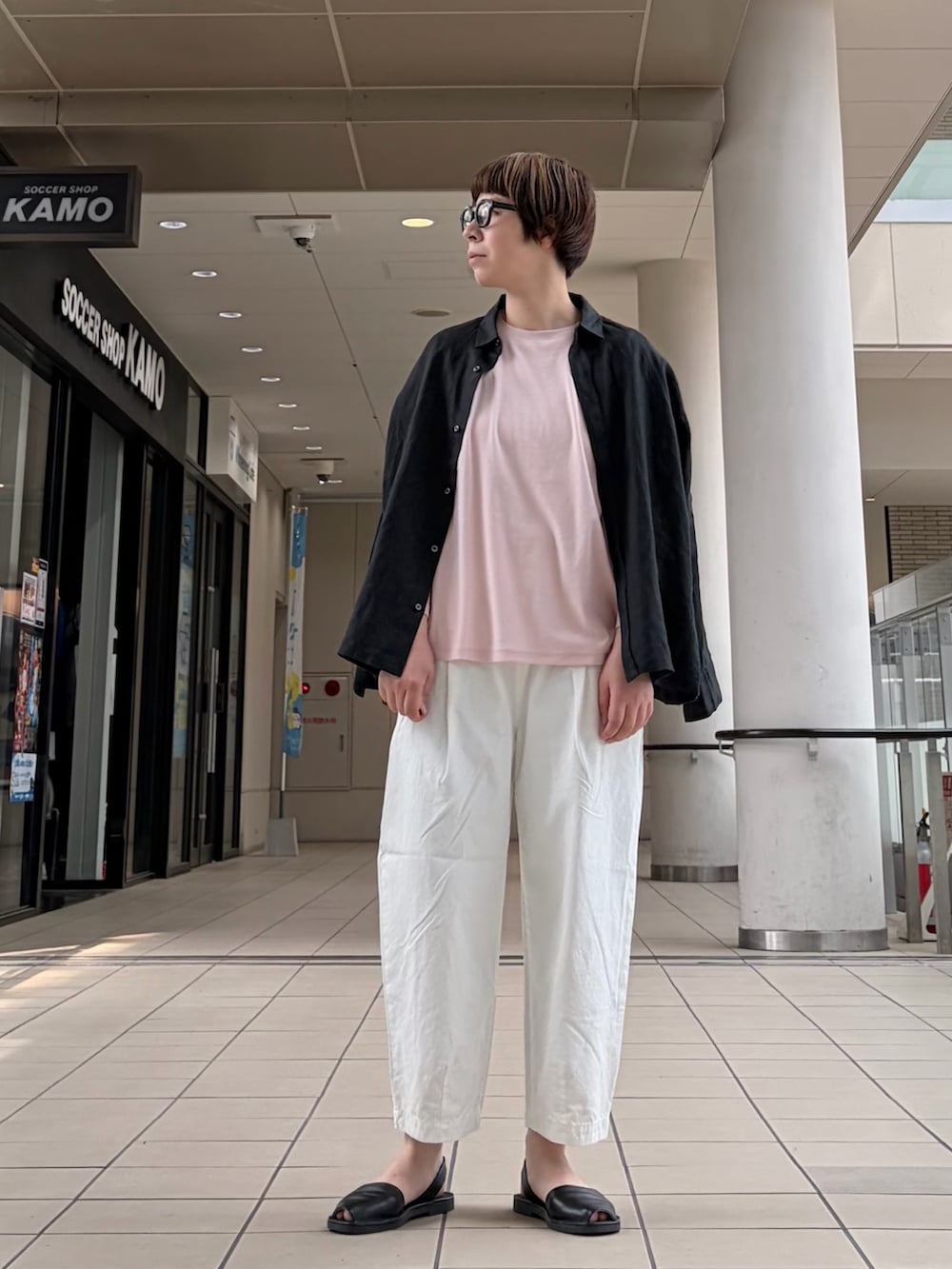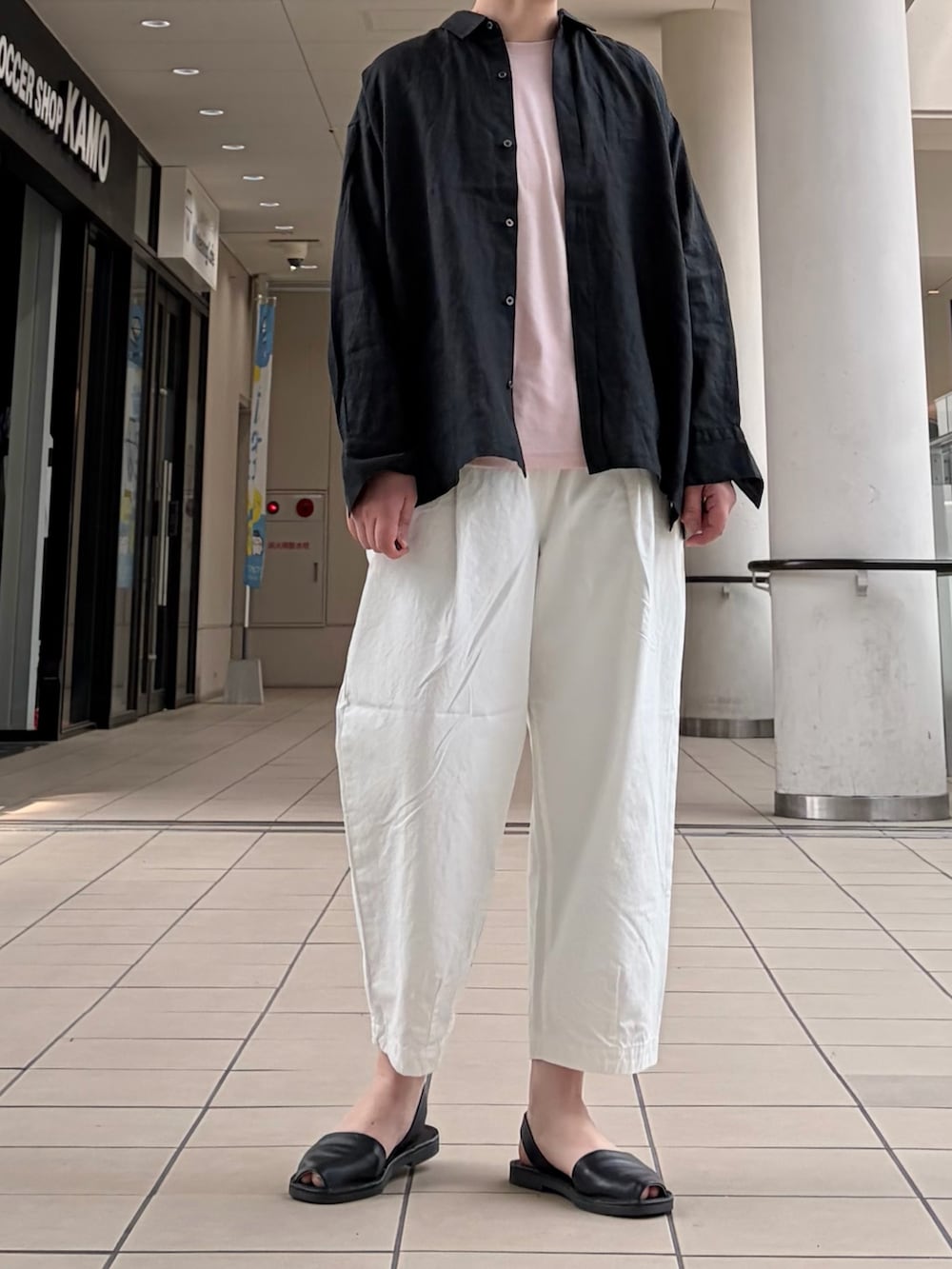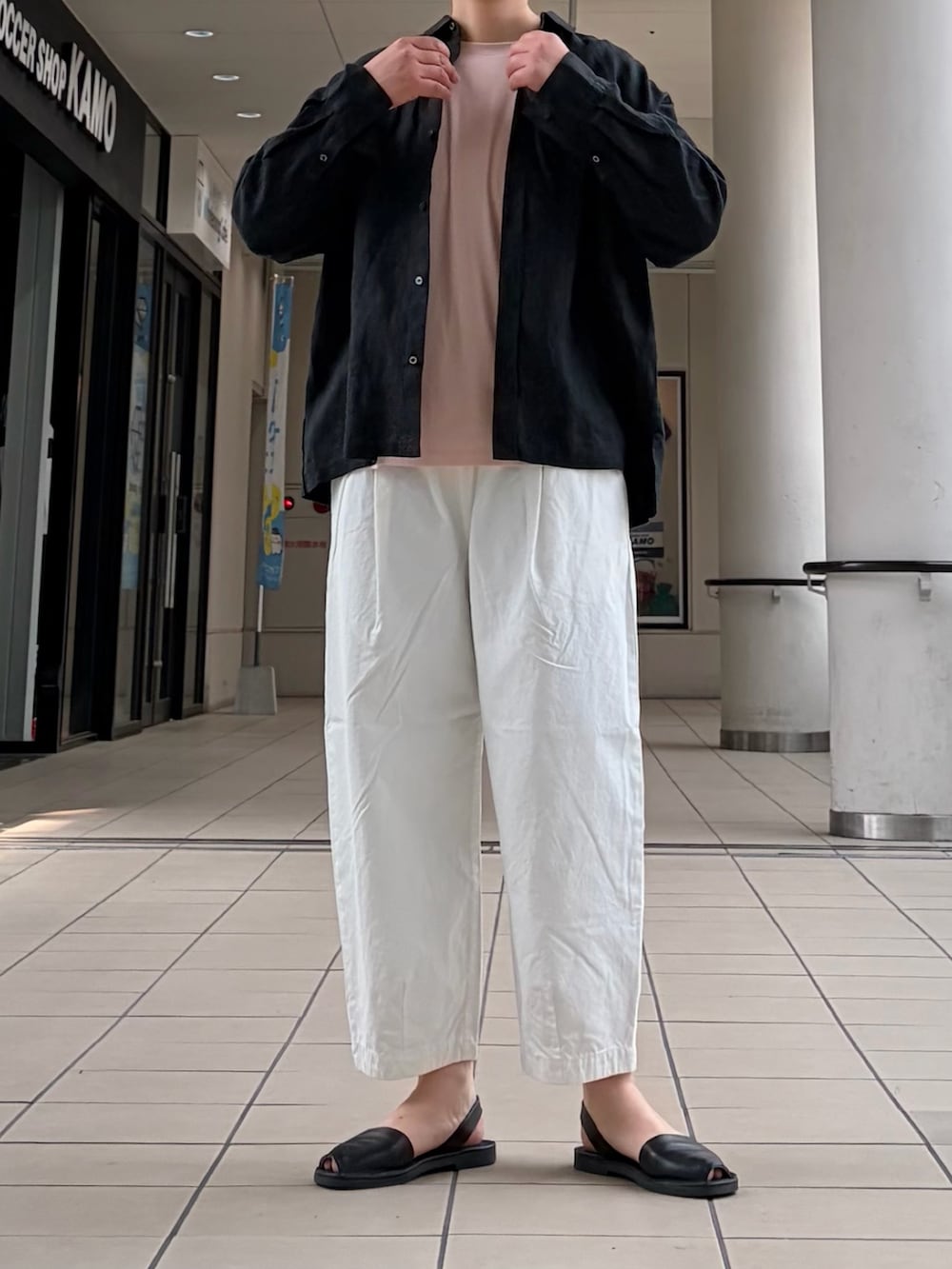 カジュアルなスタイリングも上品にまとめる1着です。1枚でももちろん、シャツやニットを上に重ねて色合いを見せるのもおすすめです。