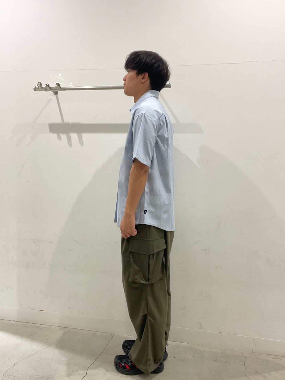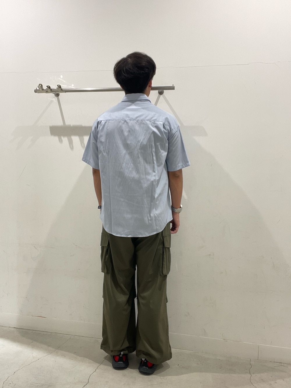 ブルーのストライプシャツにカーゴパンツを合わせたカジュアルコーデ。