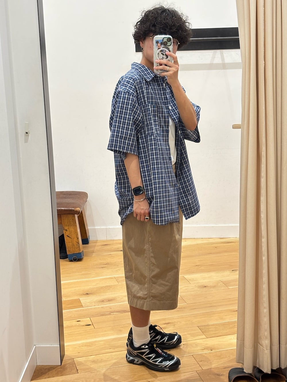 DANTONのチェックシャツと、FORK&SPOONのワイドショーツを組み合わせたスタイリングです。
