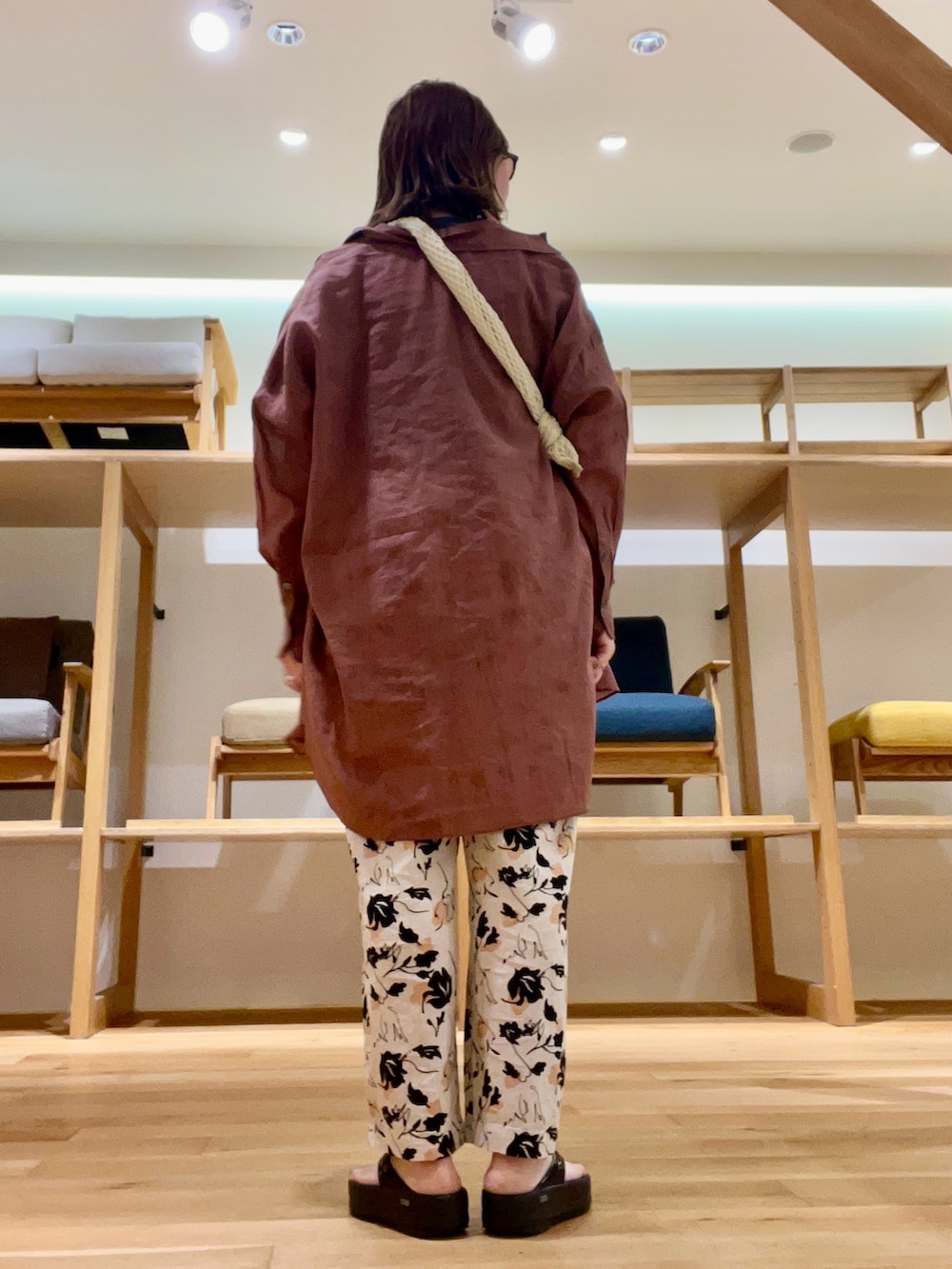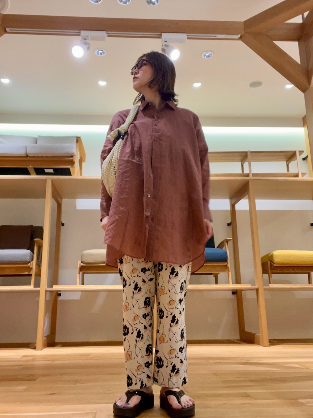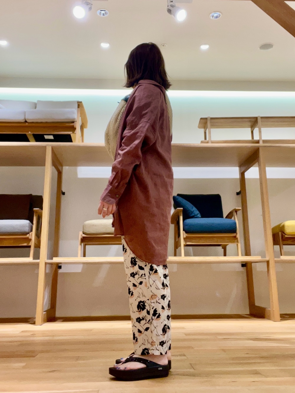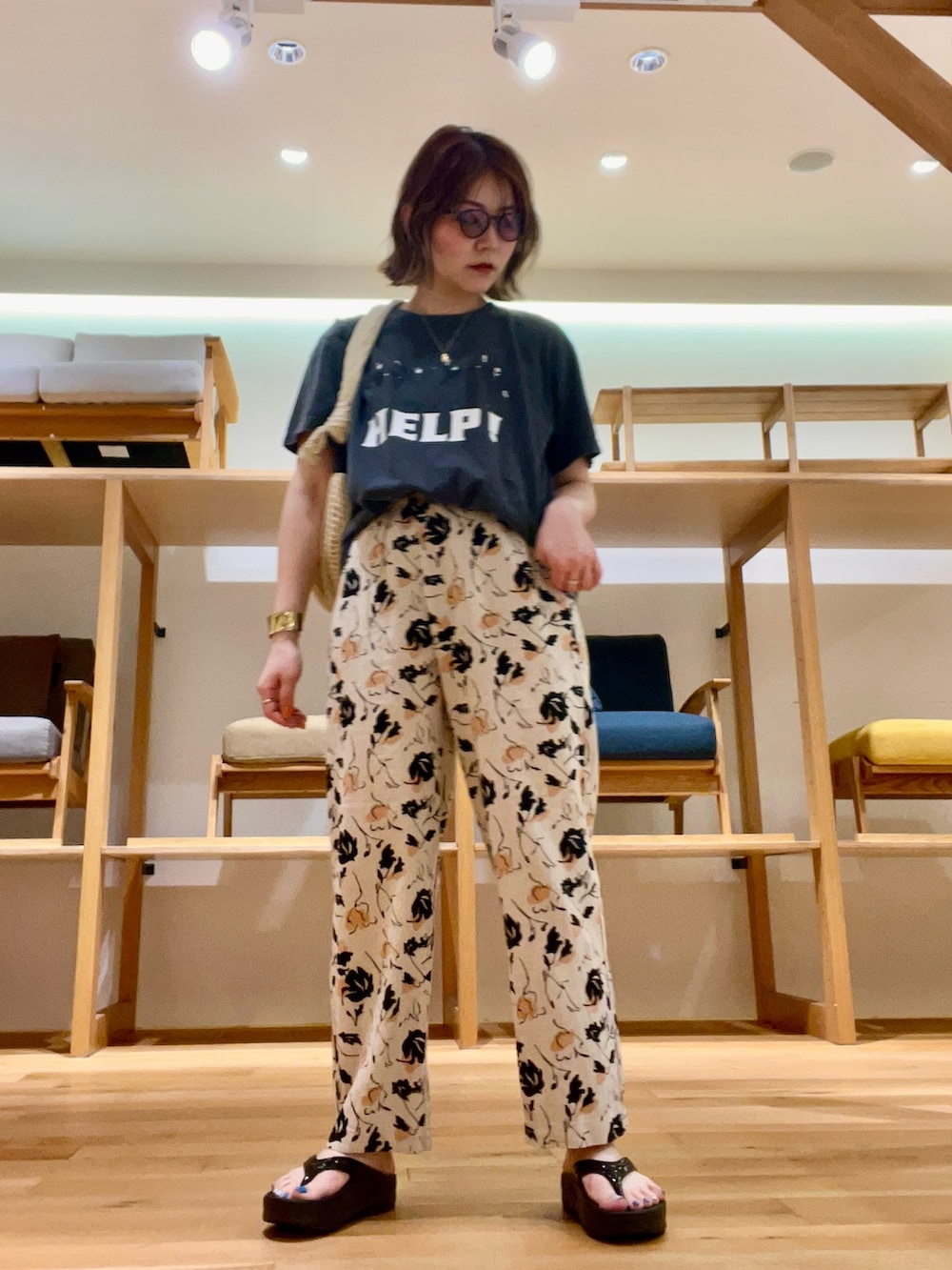 プリントパンツはカラーが色々と入っているのでトップスは合わせやすくOOFOSのサンダルと合わせラフな装いにしました‼︎