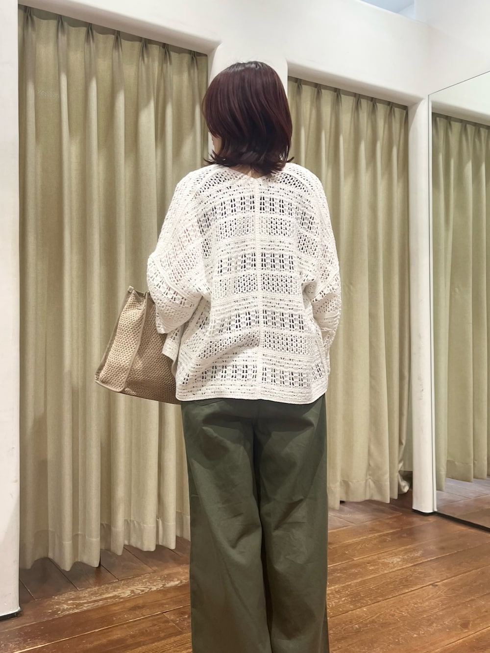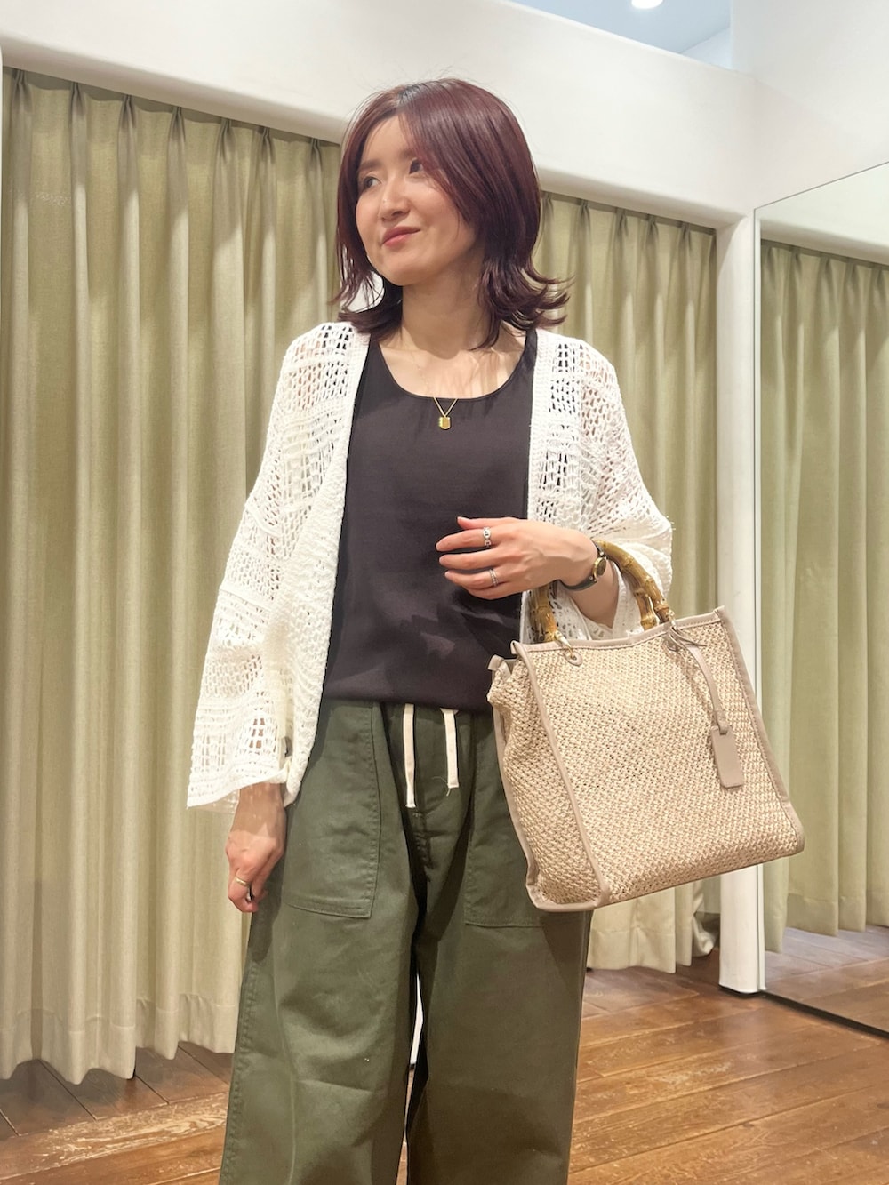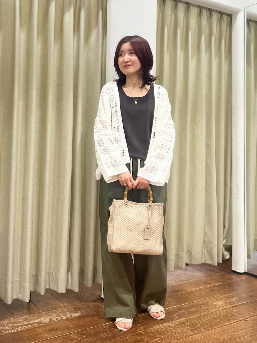 パンツは比較的しっかりした素材感なので透け感もなく、ウエストを紐で調節出来るので小柄な方にもおすすめです。スニーカーやぺたんこでも合わせやすいです。