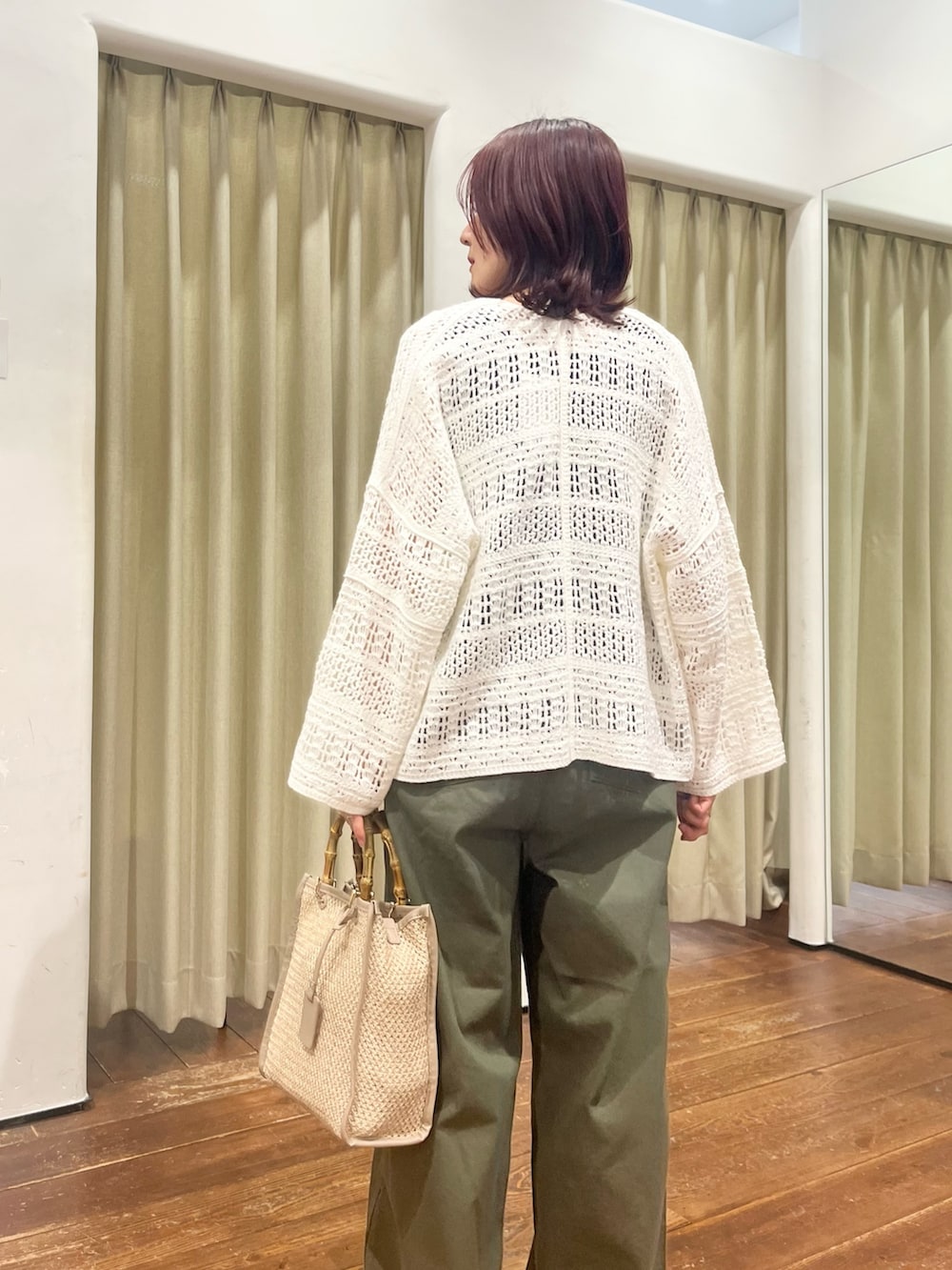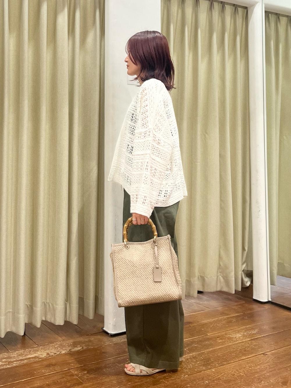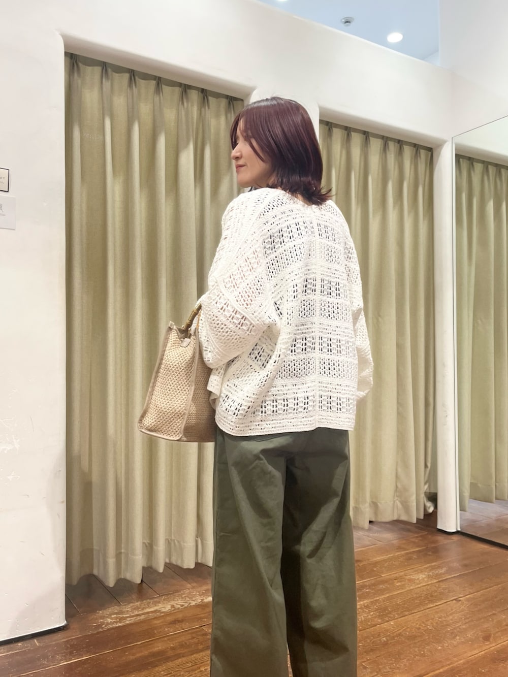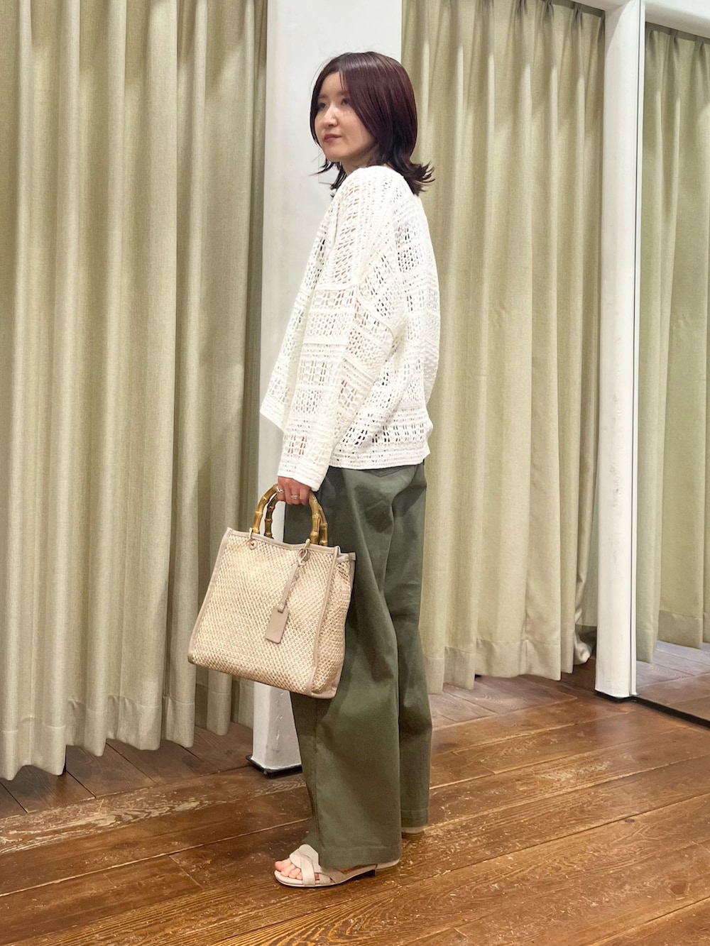 パンツは比較的しっかりした素材感なので透け感もなく、ウエストを紐で調節出来るので小柄な方にもおすすめです。スニーカーやぺたんこでも合わせやすいです。