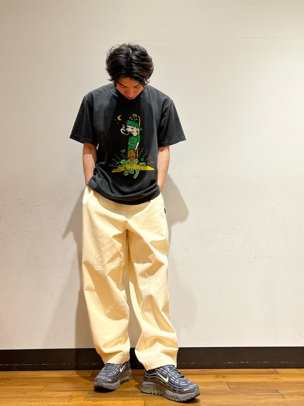 トップスはGREEN DAYのジャケ写がプリントされているバンTです!ヴィンテージ加工が施されていて、古着好きな方やバンT好きの方にもハマる1着となっております!