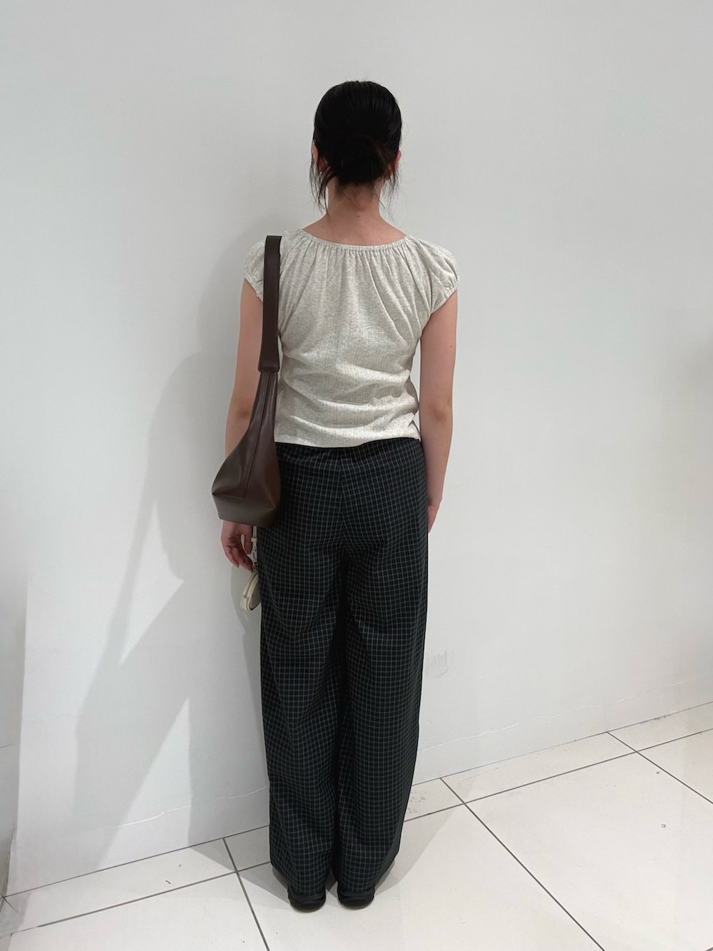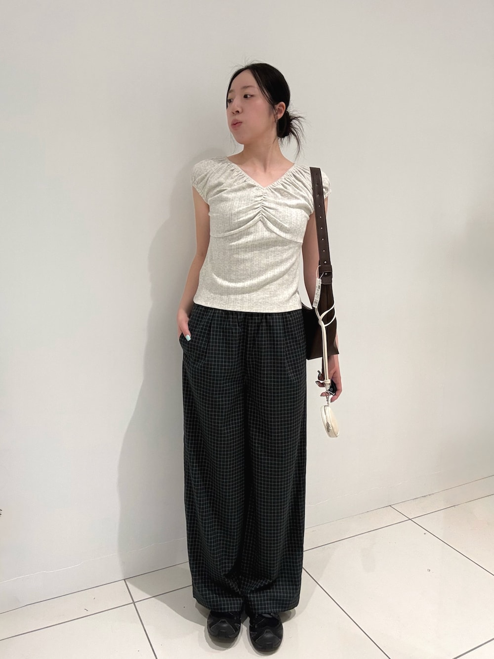 ギャザーとパフが効いたトップスとチェックのパンツを合わせたルーズなコーデです^^
