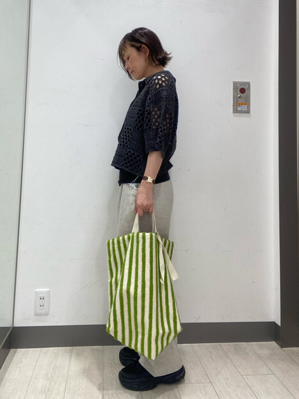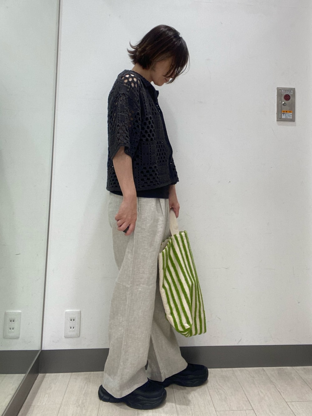 ニットシャツは、クロシェ編みですが甘くなりすぎず、パンツでもスカートでも合わせやすいです。