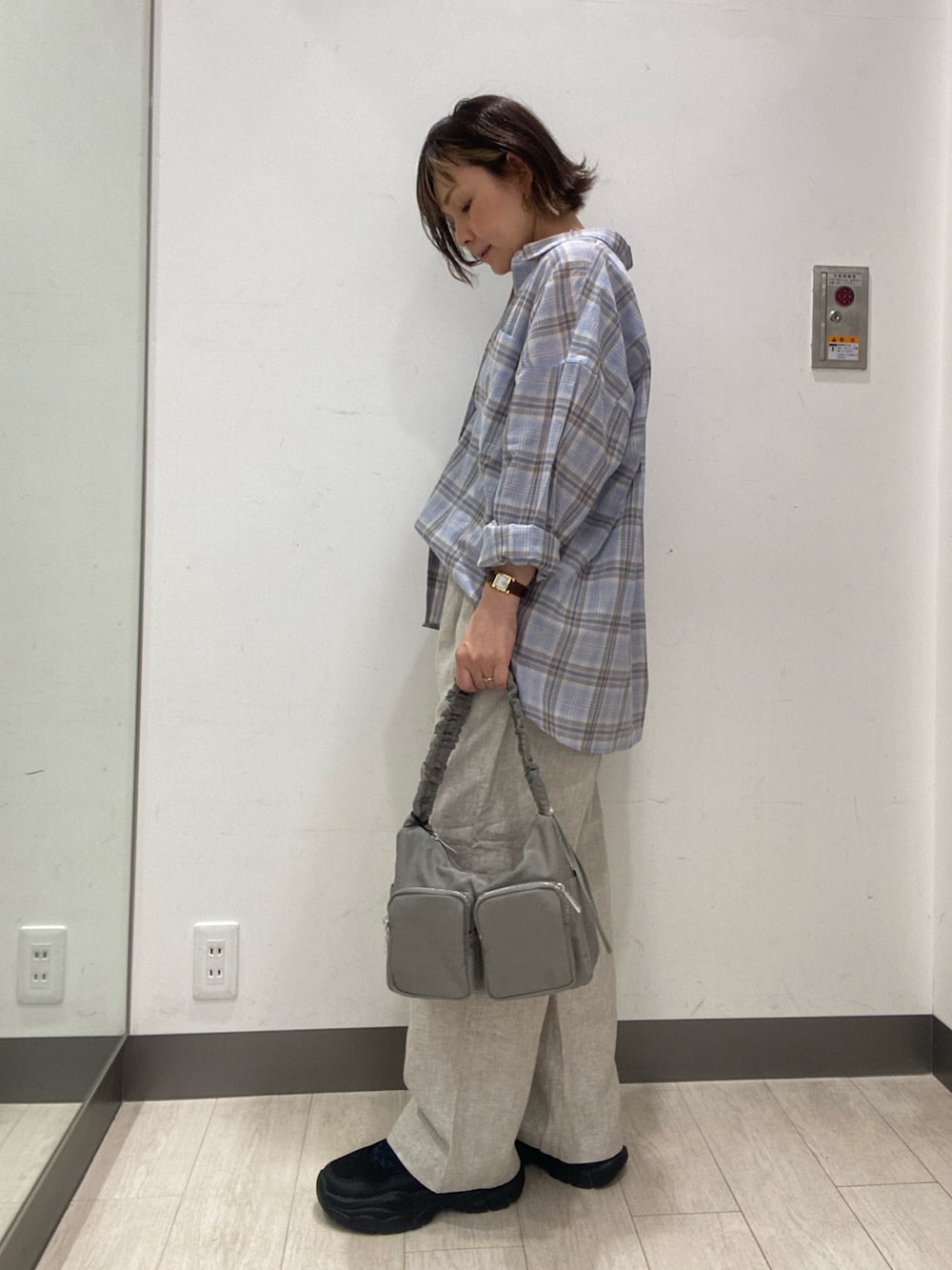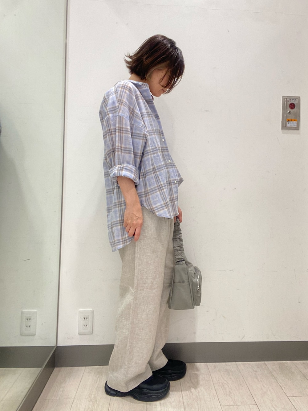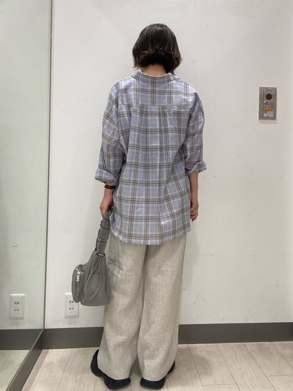 ライトブルーのチェックシアーシャツに、リネンイージーパンツです。