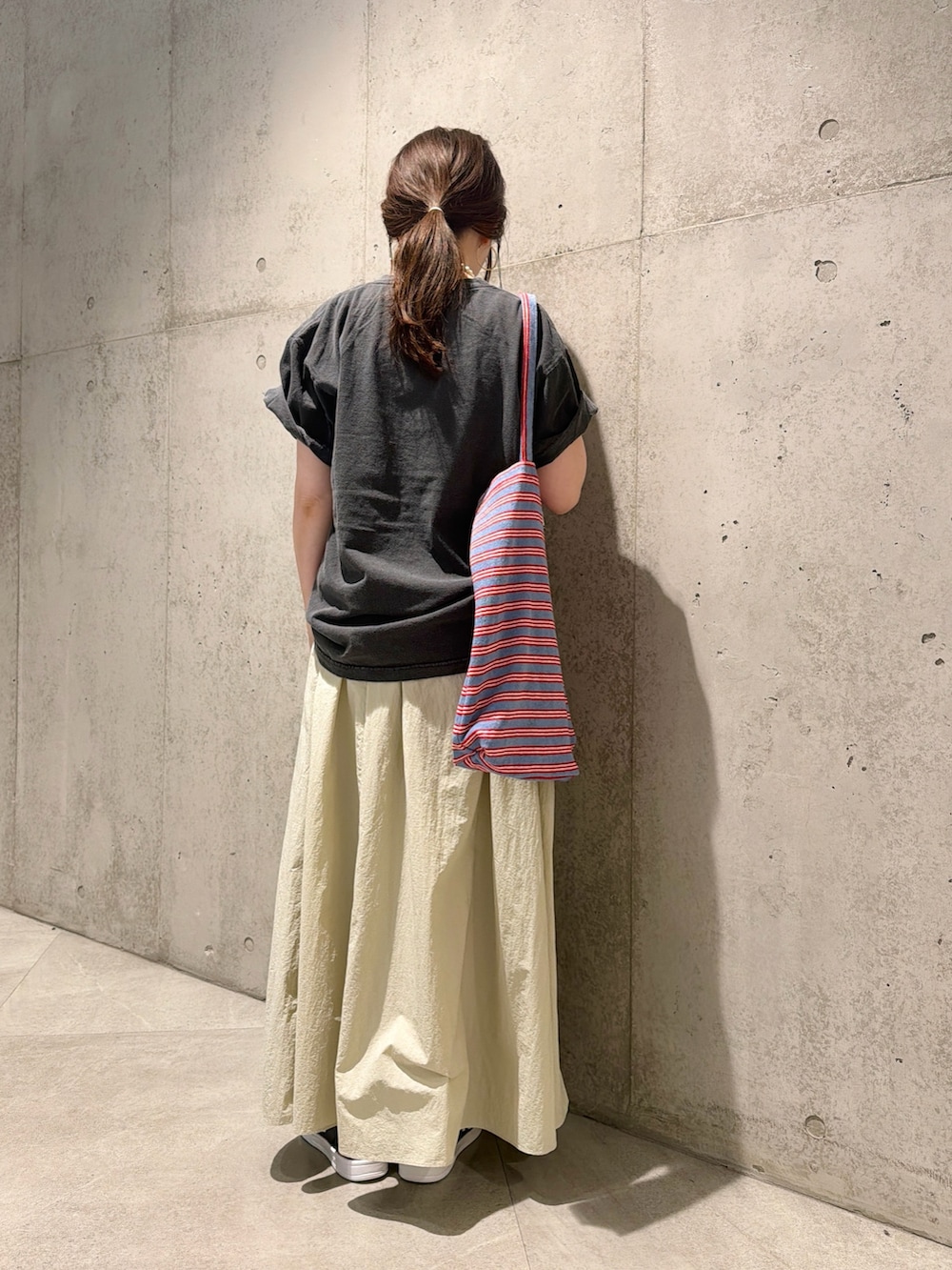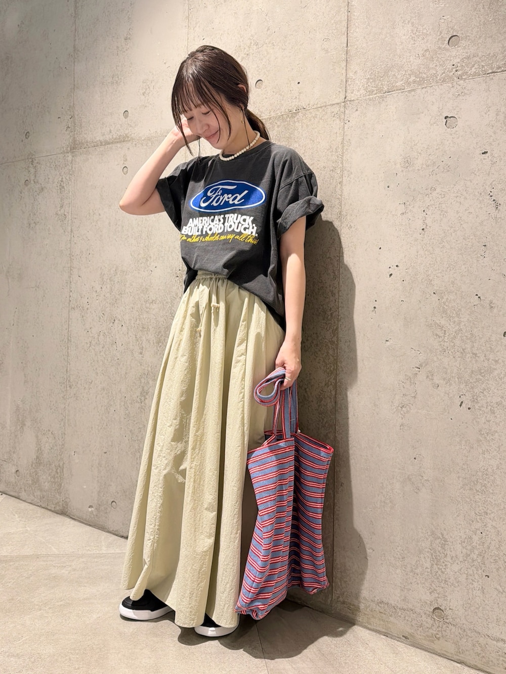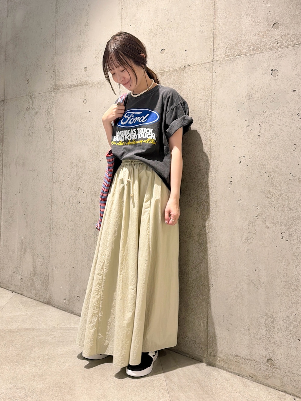 今回は、ボリューム感が女性らしいスカートを合わせてみました。