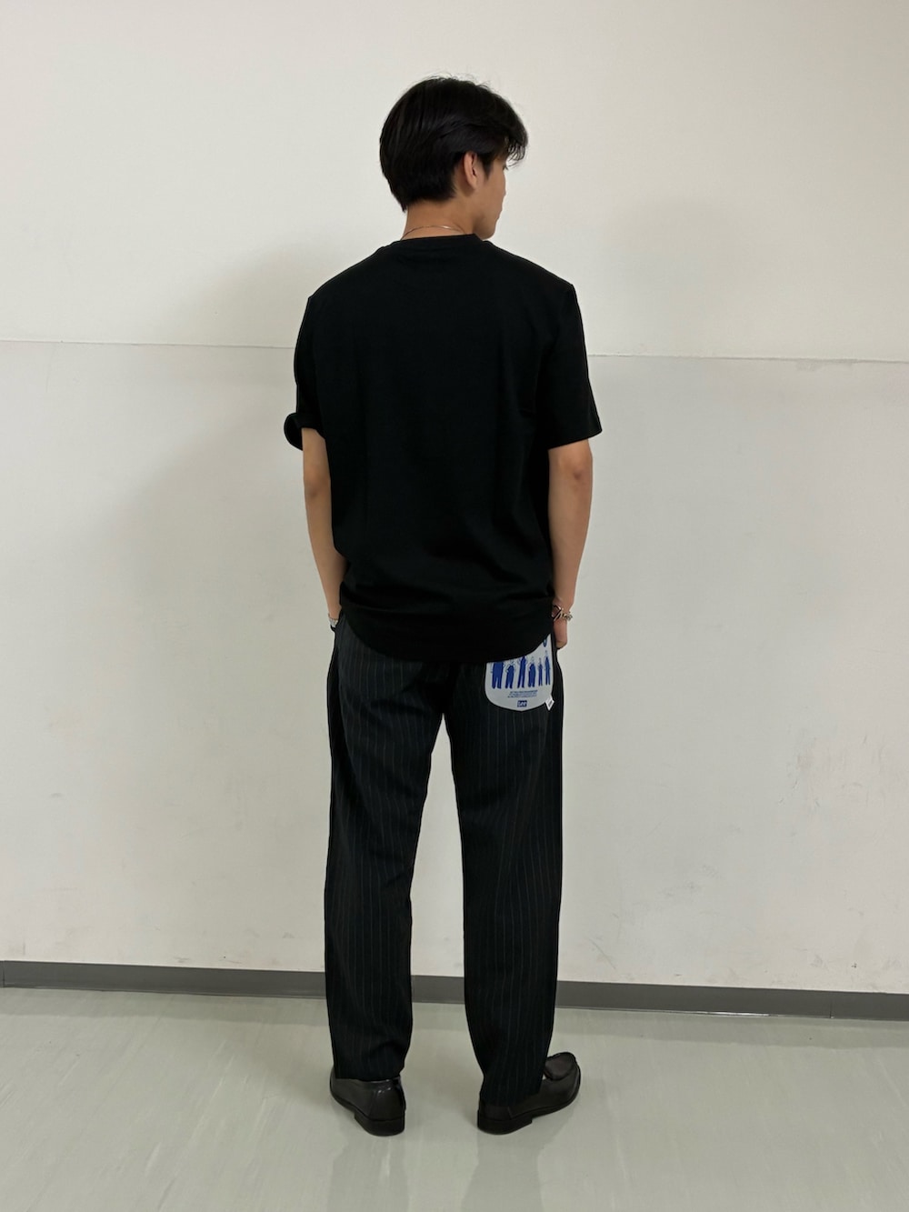 トップスは、ラコステのポケットTシャツ。お馴染みのワニロゴが「アウトライン(輪郭)」だけで表現されており、主張しすぎない控えめなデザインが大人っぽさを引き立てます。上質な黒Tシャツは、全体の印象をグッと引き締めてくれます。