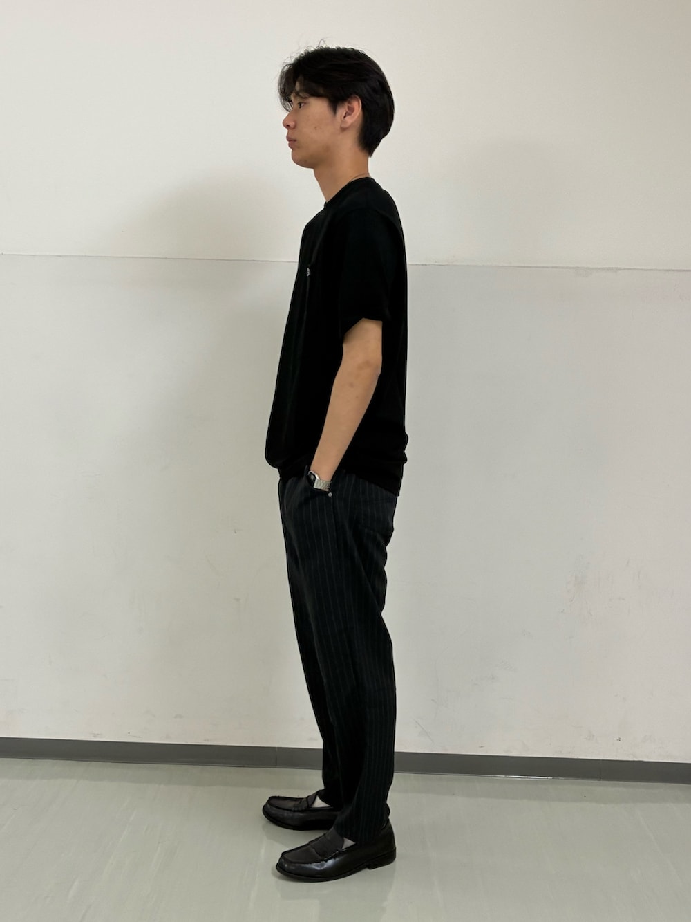 上下ブラックでまとめた、シックで洗練されたカジュアルスタイルです。