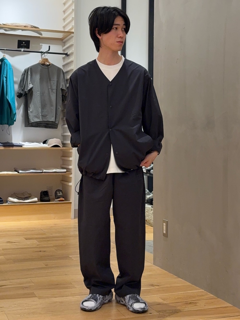 足元はMERRELL別注のスライドサンダルでラフに合わせました。