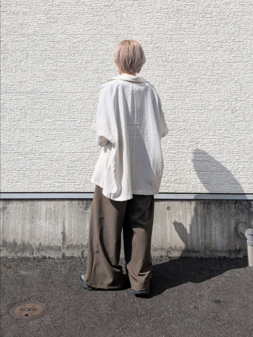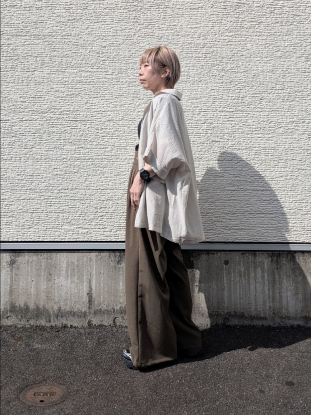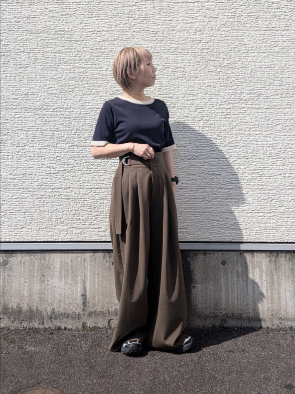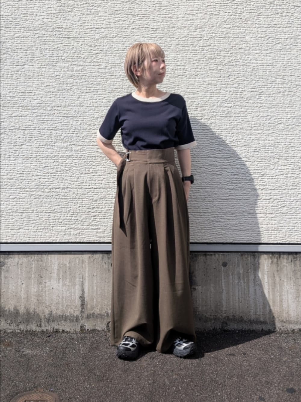 アシメデザインのパンツはハイウエストなデザインで脚長効果◎