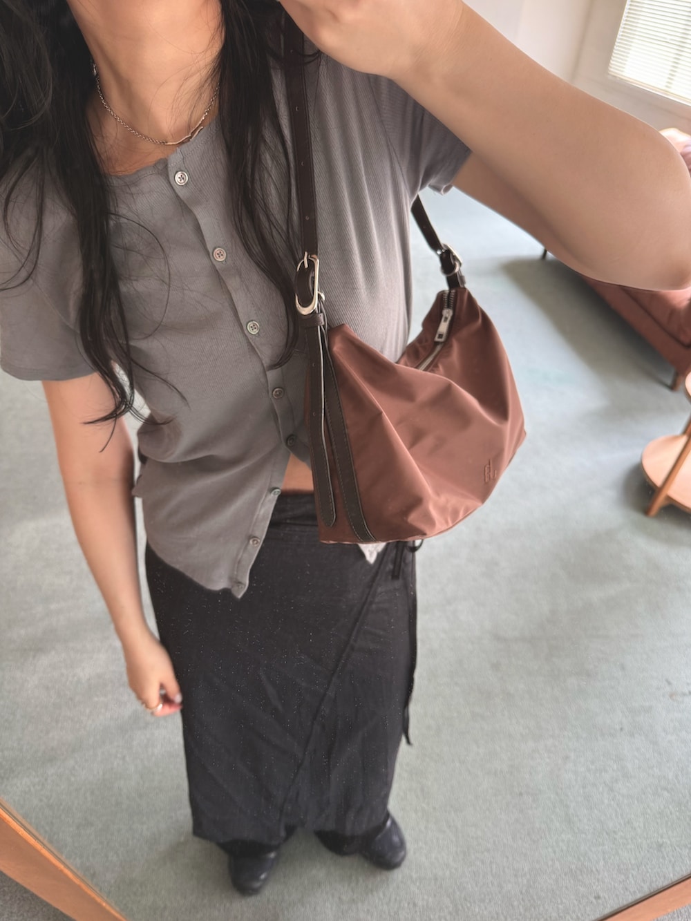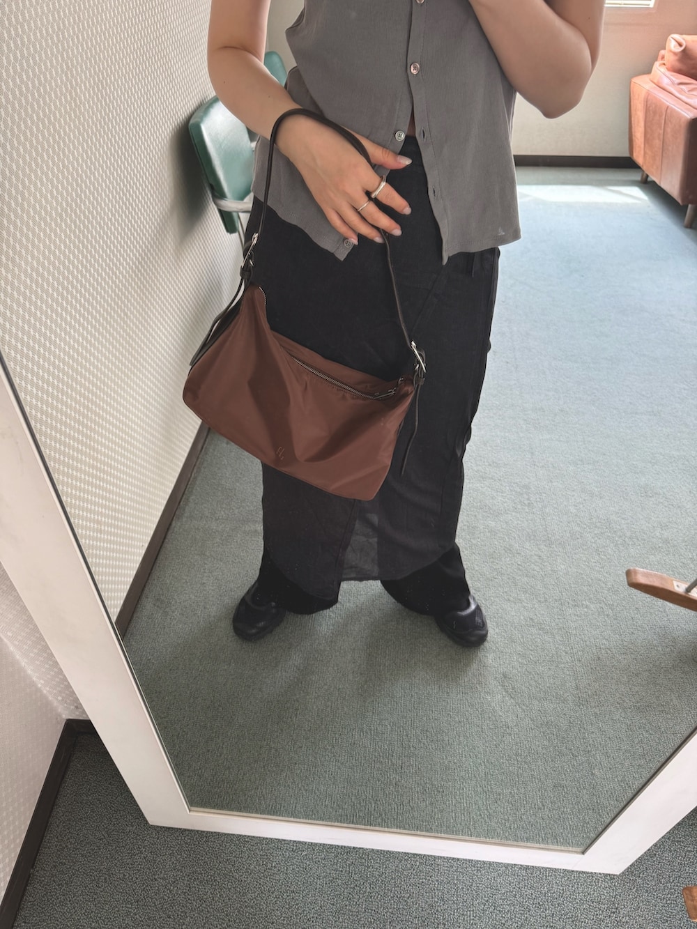 モノトーンのシンプルコーデに、アクセントとしてbrownのbagをオンしたコーデ。