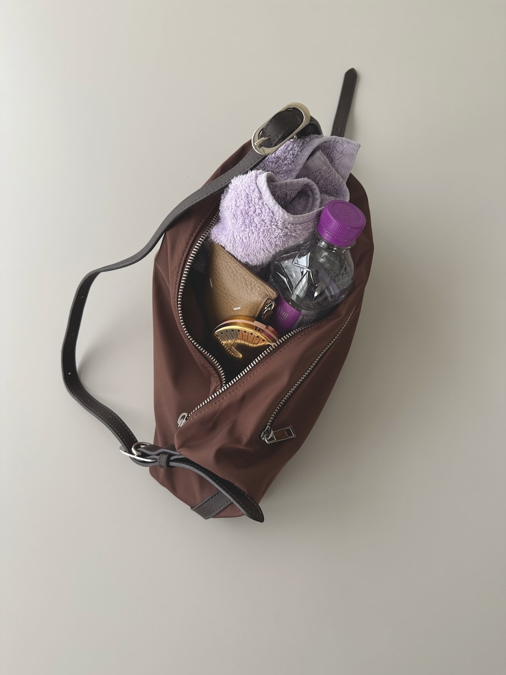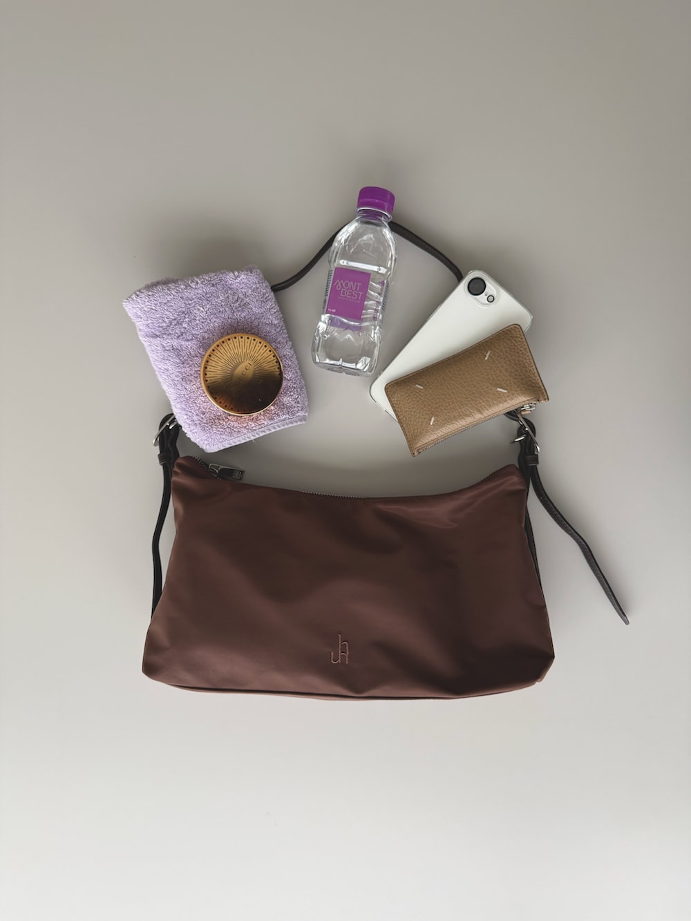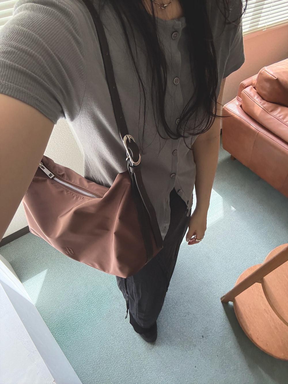 ウェアを薄手生地の上下にしたので、bagの質感が上品さをプラスしてくれます。