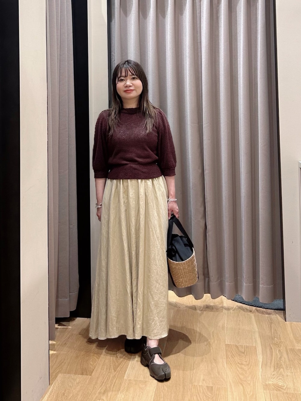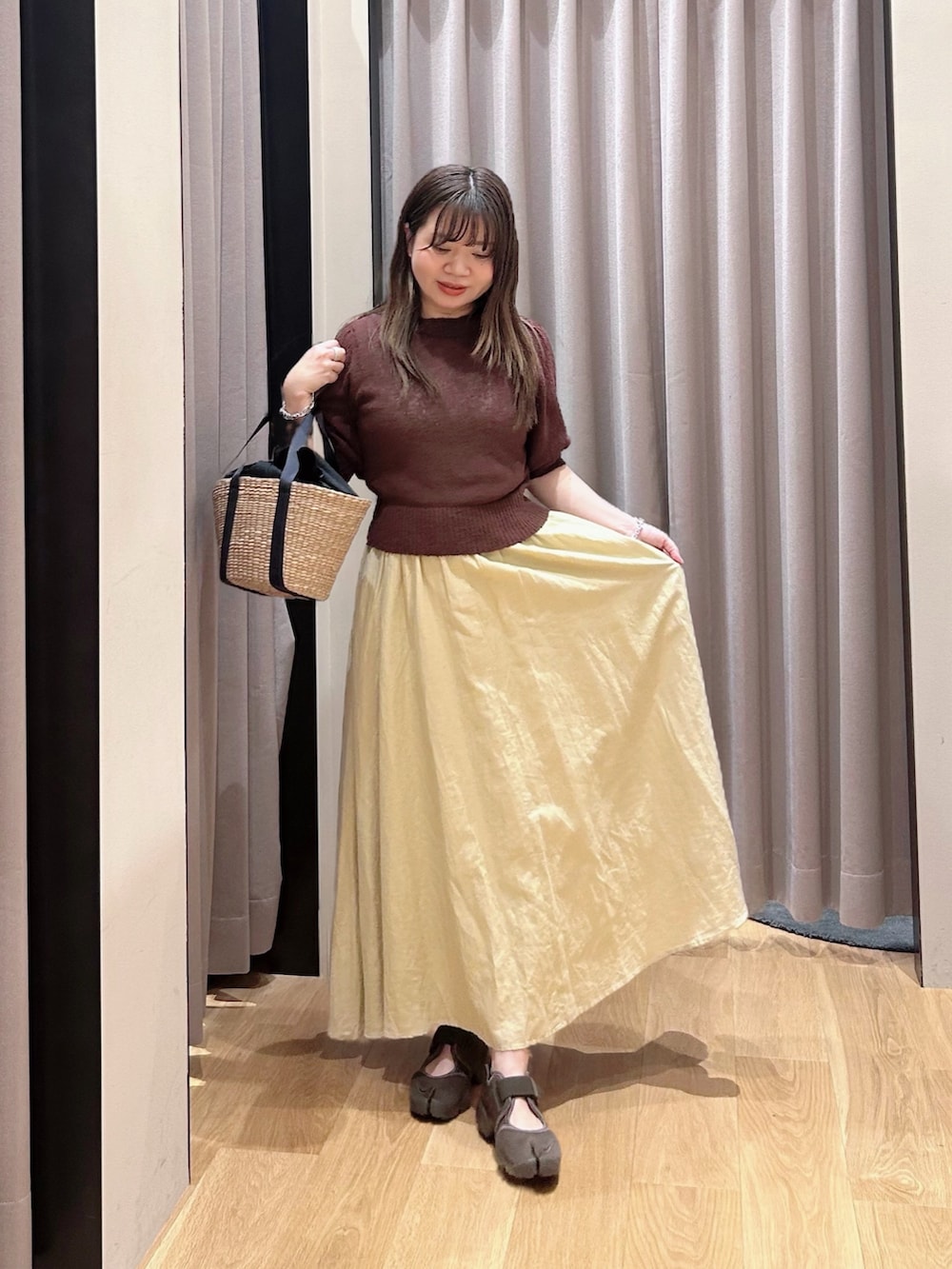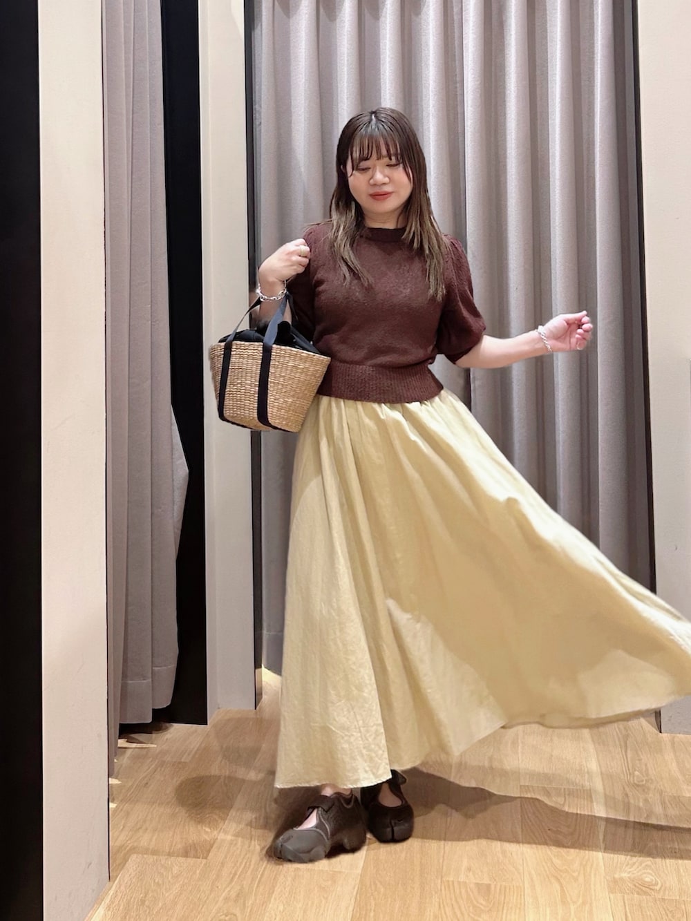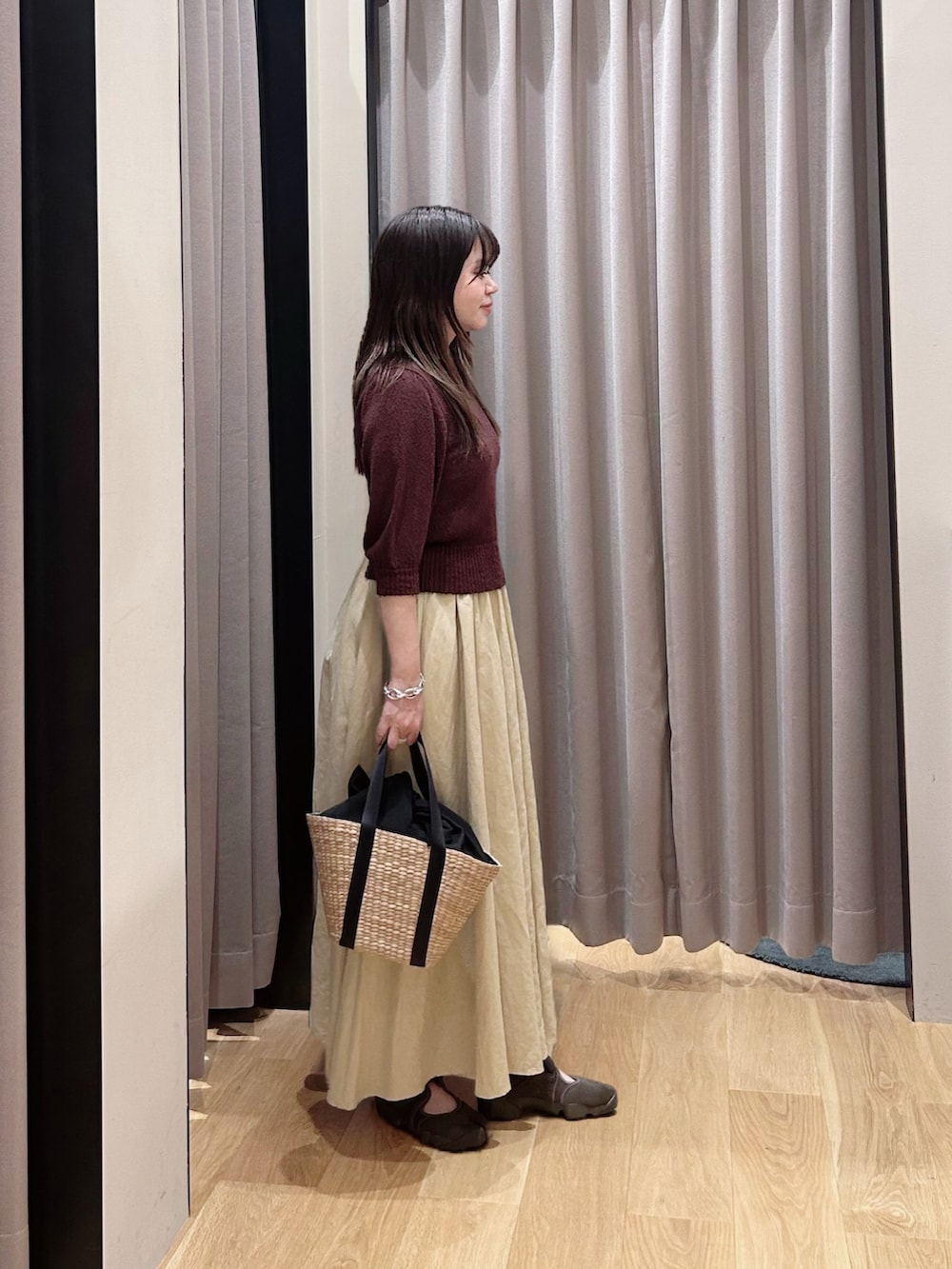 ショート丈なので着用のようなフレアシルエットのスカートと相性◎