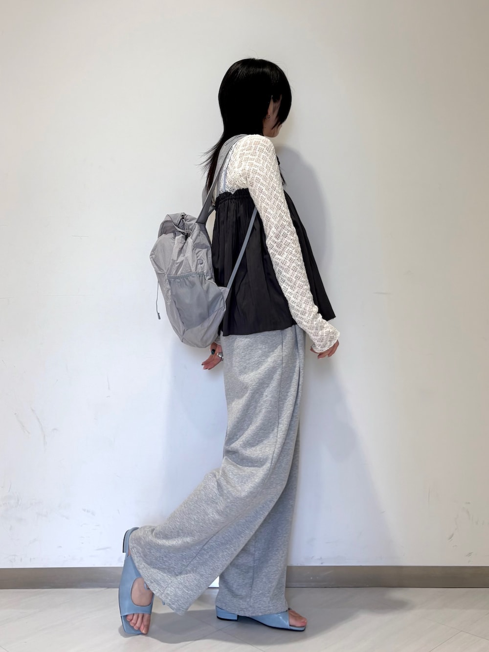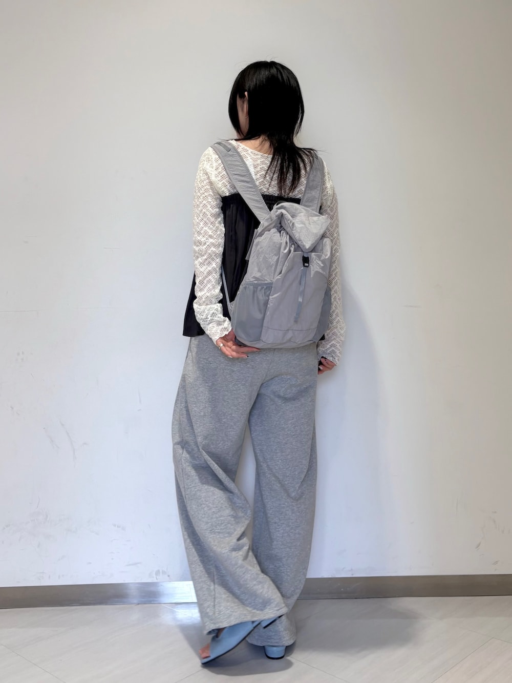 トップスもお靴もきちんと感あるアイテムを集めたので、リュックとスウェットパンツでラフさを出しました〜