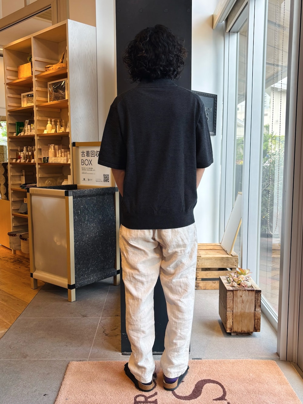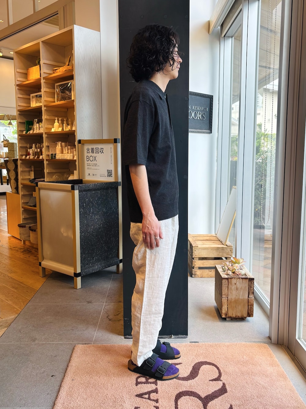 夏らしくリネンパンツとサンダルで合わせてます。
