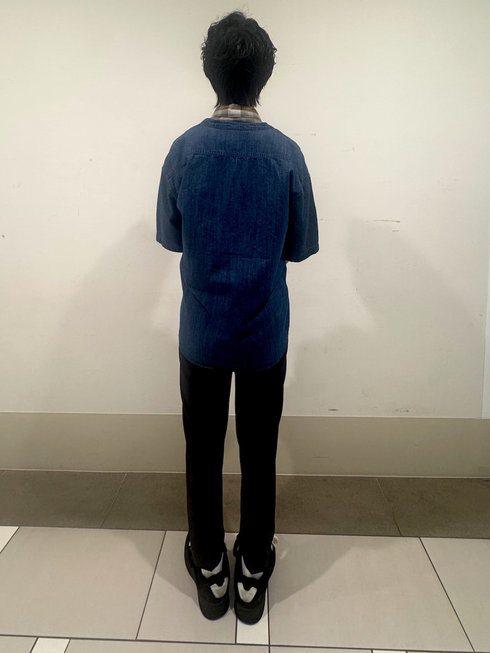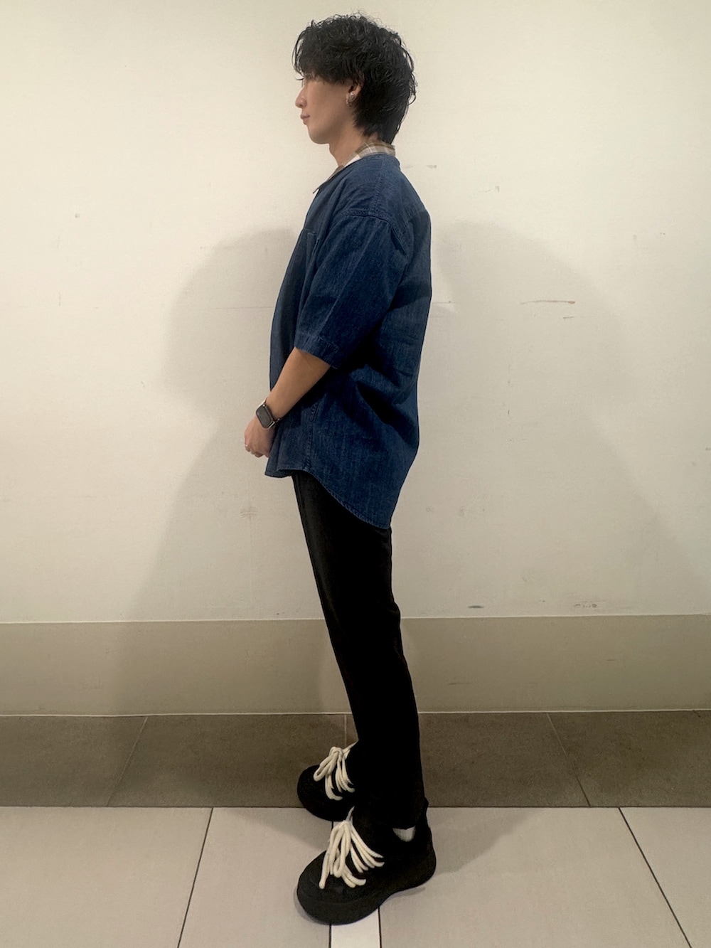 ボトムスはすっきりとしたブラックトラウザーで全体を引き締め、バランスよくまとめたスタイリングに。