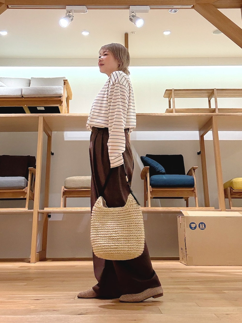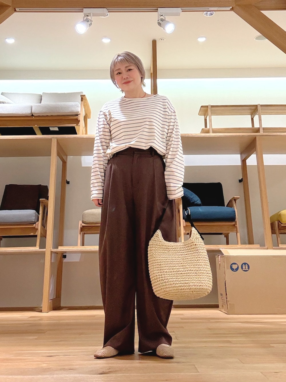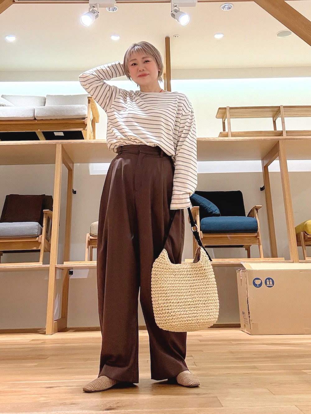 ブラウン×アイボリーのやわらかい配色で、大人っぽく抜け感のある印象に。