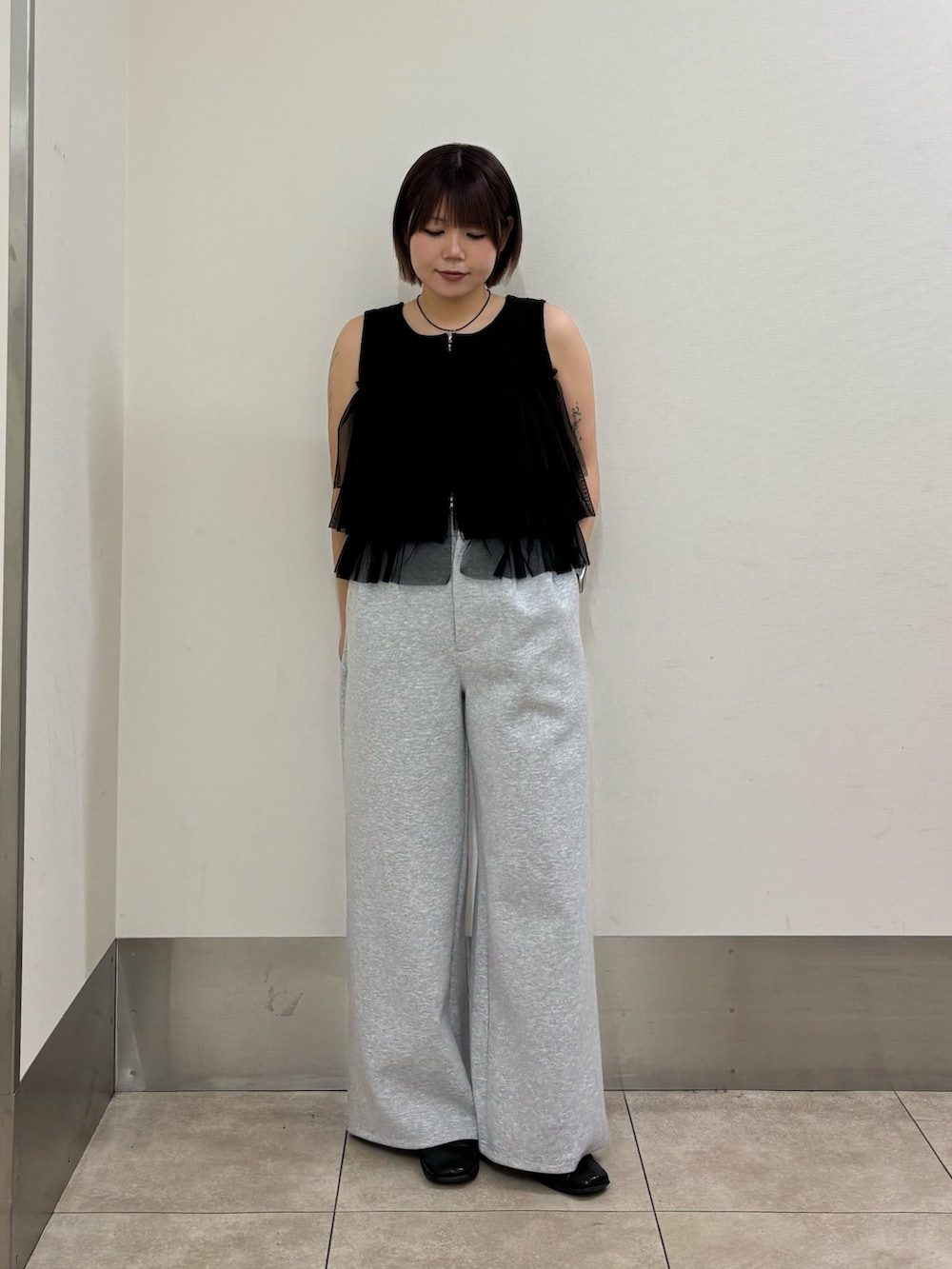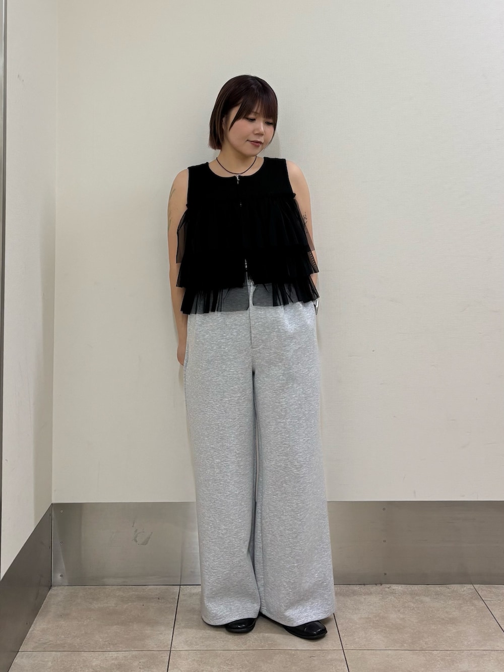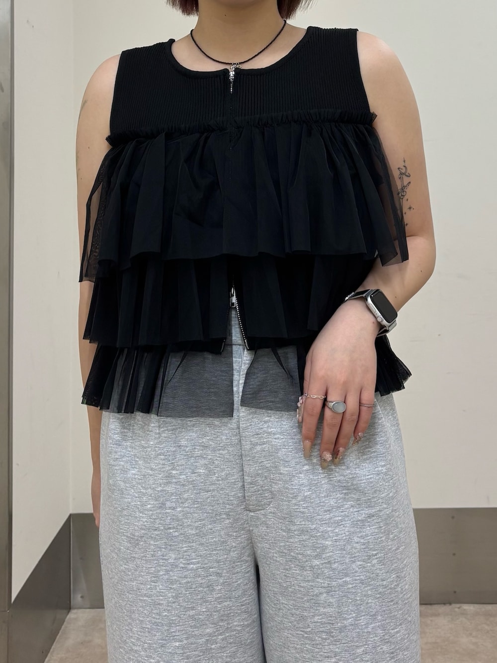 細見えするリブニット生地にチュールのフリルがドッキングされた大人可愛いアイテムとなっております!