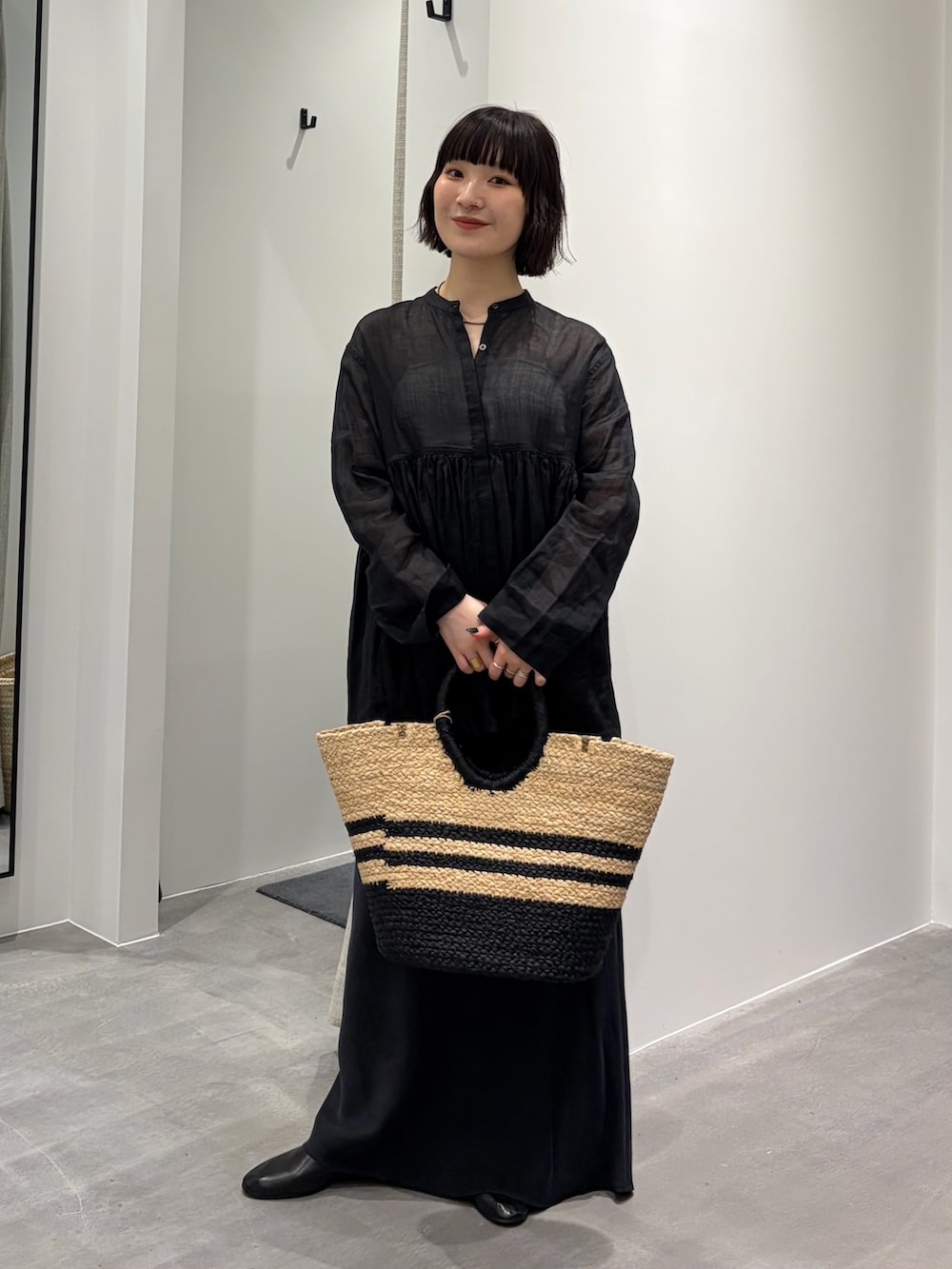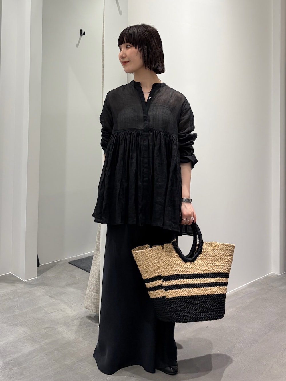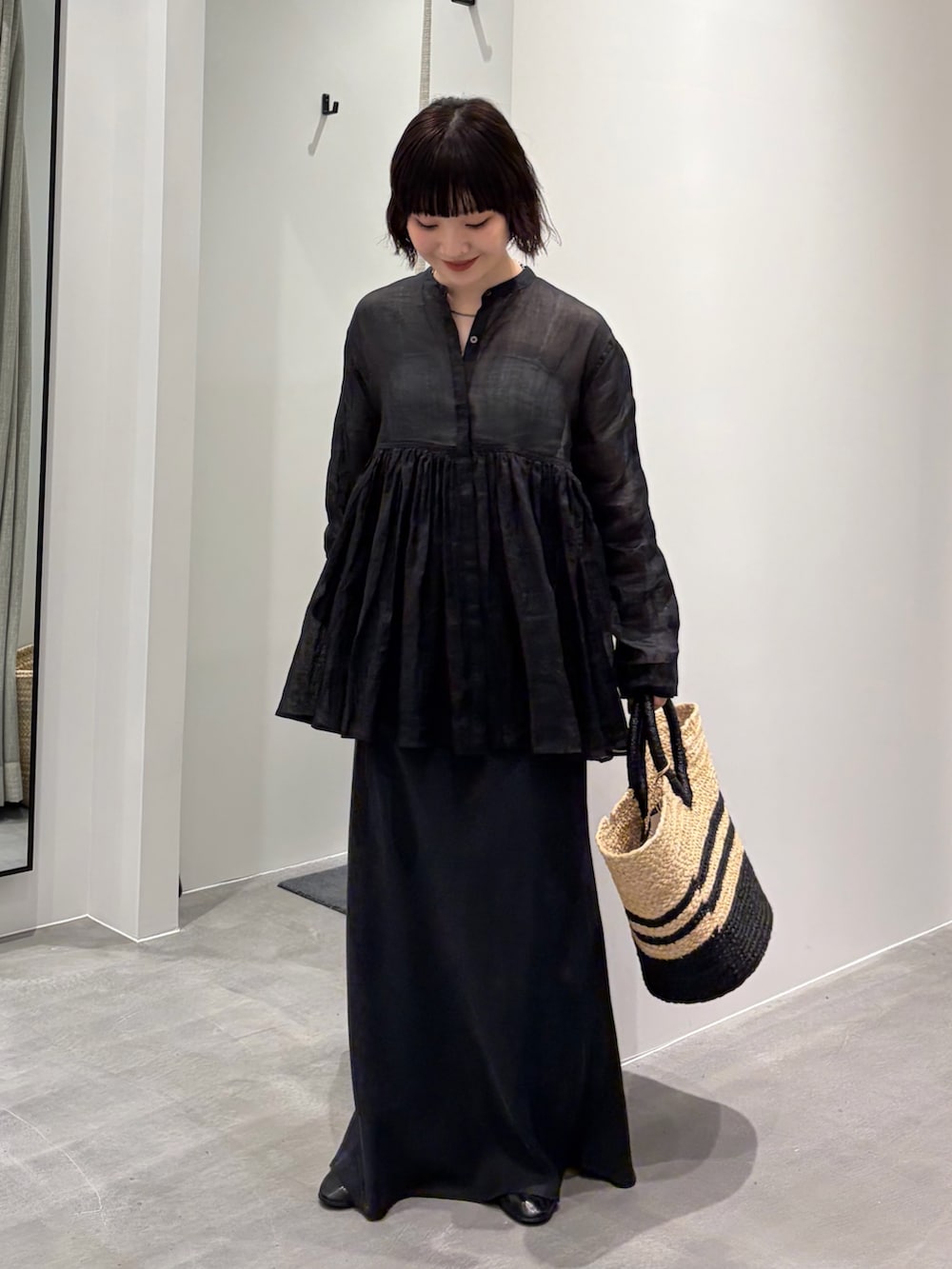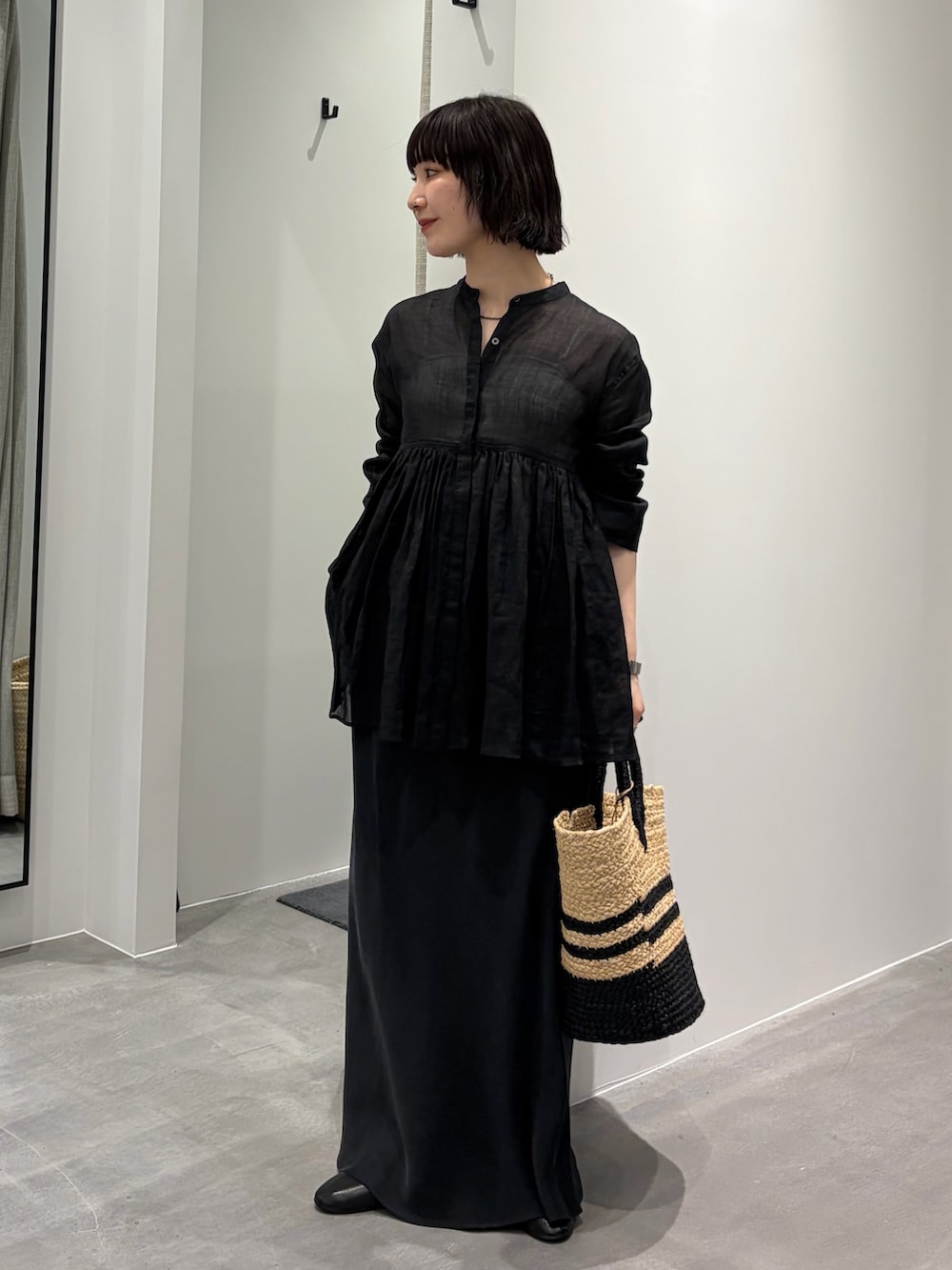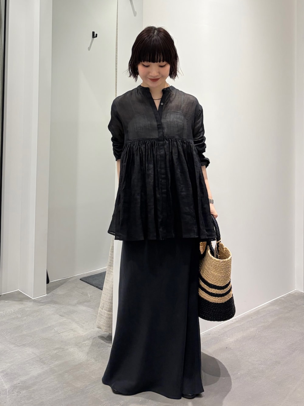 ラミーのパリッとクールな風合いを持たせつつ、ウエストの切り替えで可愛らしさも。