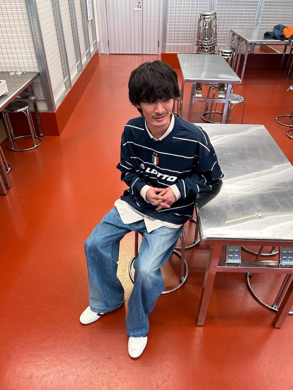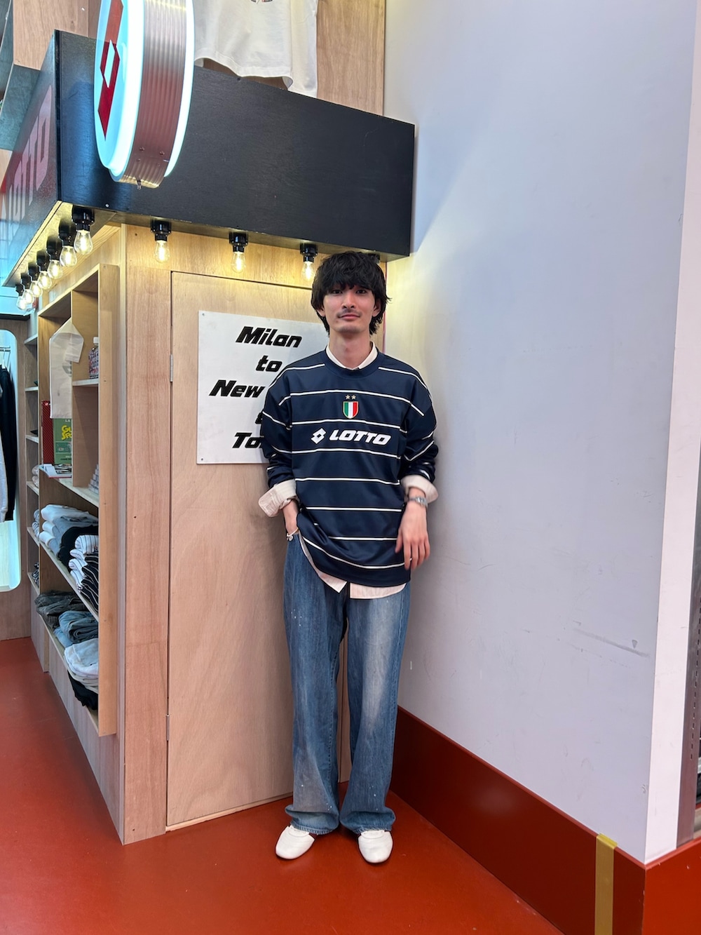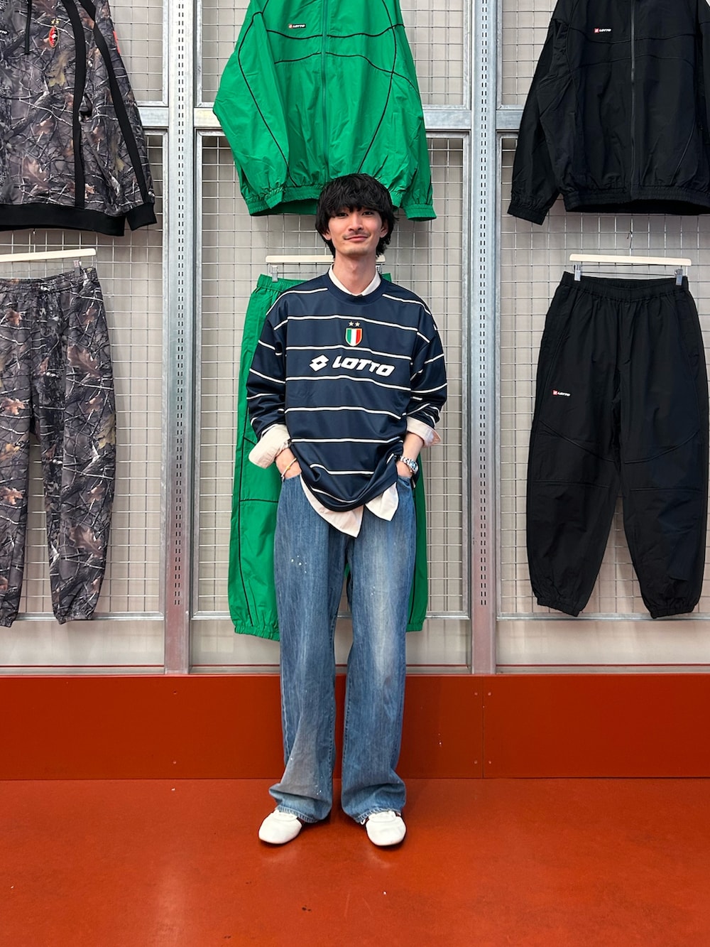 LOTTOのゲームシャツはほどよい光沢感が、スタイルに馴染みやすいポイント。カジュアルにデニムなんかと合わせるのがおすすめです。